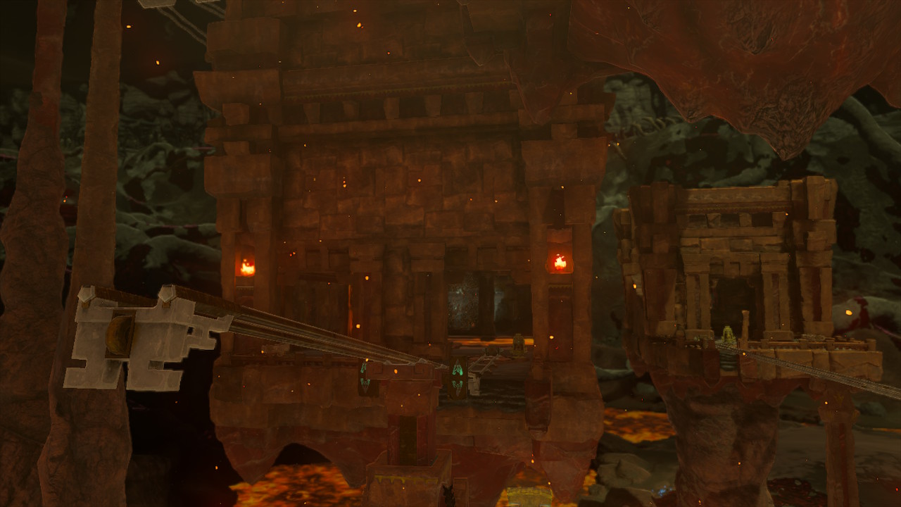 Une fois que tous les gongs ont été activés, la gigantesque porte métallique derrière laquelle a disparu Zelda peut enfin être abaissée. Retournez au portail soneau et abaissez-la. Une fois la porte passée, vous arriverez dans une gigantesque pièce sphérique avec de la savouroche au centre du plafond. Grâce à la forme sphérique de la pièce, le pouvoir de Yunobo peut atteindre le plafond. Faites appel à lui pour détruire la savouroche qui se trouve au plafond, cela fera apparaître Lithogohma, le boss du temple du feu.