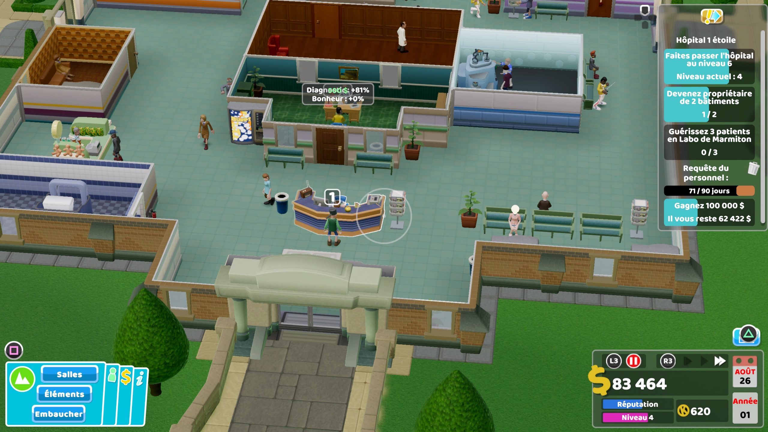 D’ailleurs, sachez que plus votre taux de patients guéris est élevé, plus la réputation de votre hôpital grimpera. Le but étant bien évidemment d’obtenir les 3 étoiles pour chaque infrastructure et durant chaque mission. Par la même occasion, vous gagnerez des Kudosh, la monnaie in-game, aspect sur lequel nous reviendrons un peu plus tard.