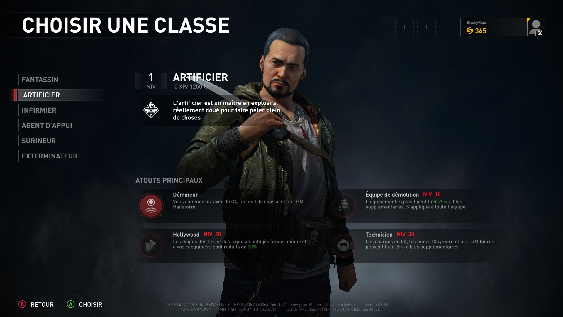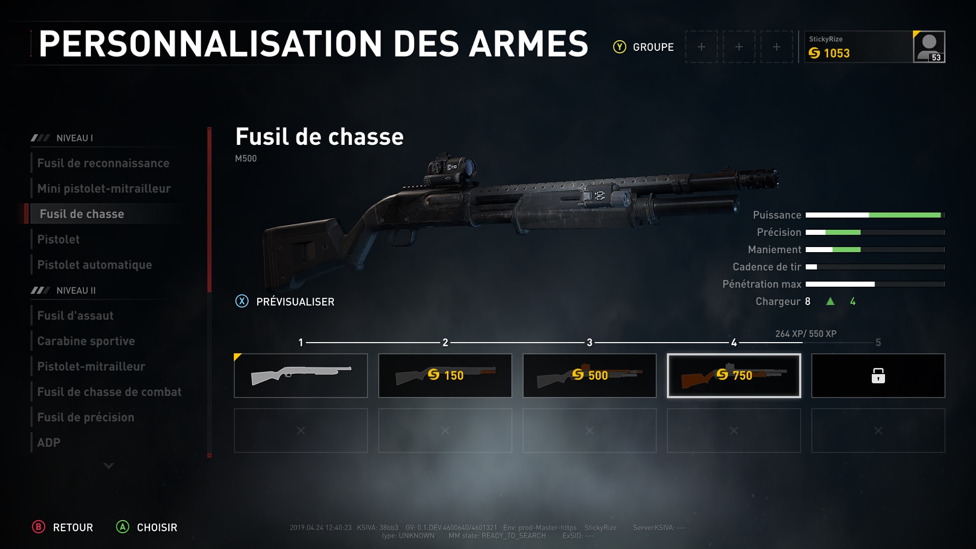 - Arme principale : Fusil de chasse M500 niveau 1 et 0 expérience