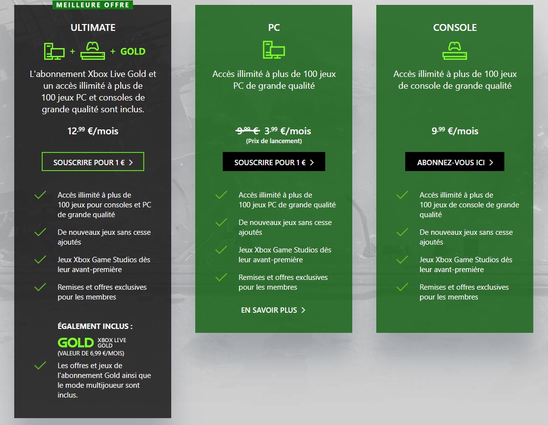 Vous l’aurez compris c’est l’abonnement qui prime sur la plateforme. Pour pallier cela une troisième offre de souscription est disponible : le Xbox Game Pass Ultimate. Celle-ci permet d’avoir, pour un prix de 14.99€ par mois et sans condition d’engagement, les deux catalogues de jeux sur les deux plateformes ainsi qu’un abonnement au Xbox Live Gold (abonnement qui permet de jouer en ligne pour les joueurs de Xbox One puis donnant accès également à des jeux offerts chaque mois). Vous aurez également des sorties en avances sur pour certains titres ou des versions « Ultimate ».