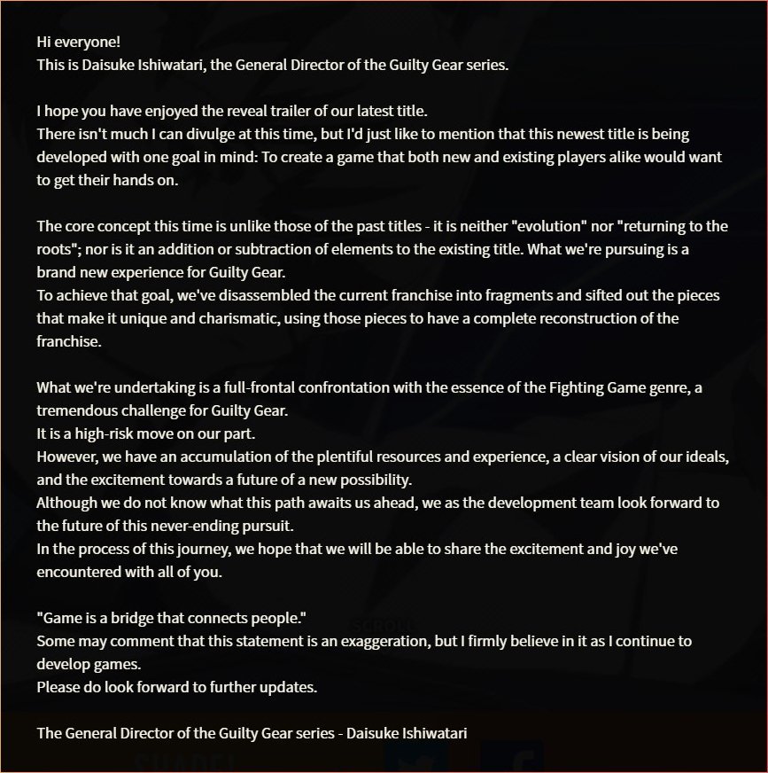 - Daisuke Ishiwatari précise que son équipe ne souhaite pas faire évoluer la formule ou retourner aux bases de la série, tout comme il ne s’agit pas de simplement ajouter ou retirer des choses. Non, le prochain Guilty Gear est annoncé comme une toute nouvelle expérience. Pour y arriver, les développeurs ont fragmenté les différents opus de la série et ont sélectionné les éléments qui la rendent « unique et charismatique », afin de proposer par la suite une « reconstruction de la franchise ».