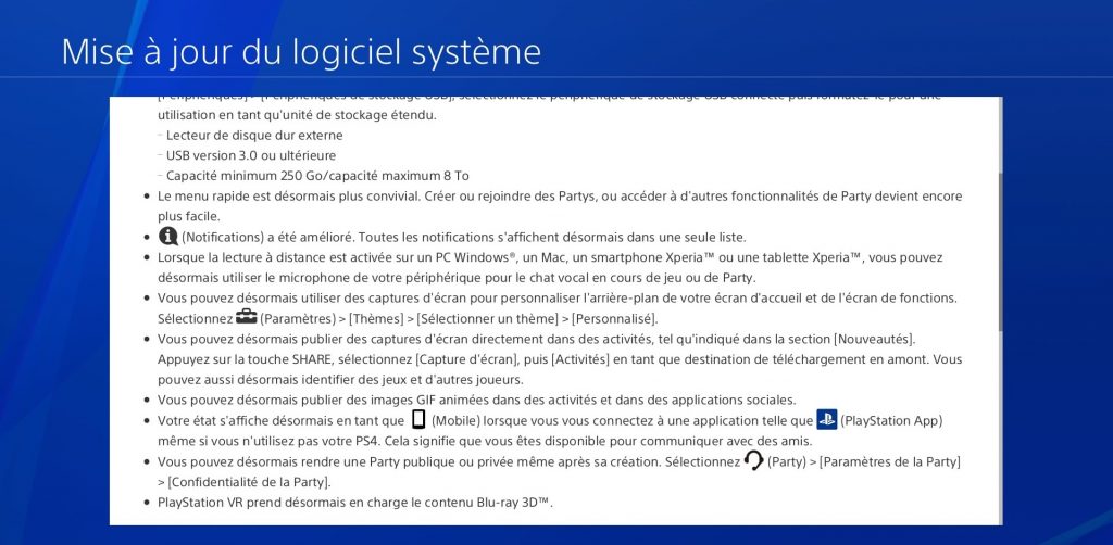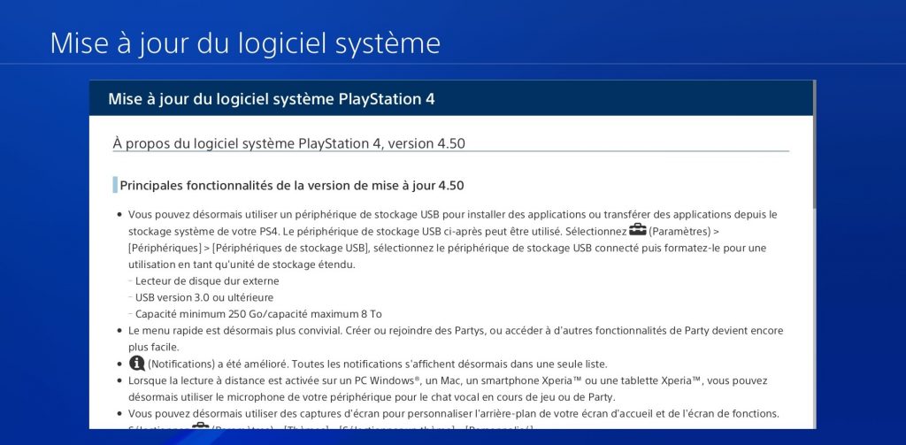 Cette update fait 339,9 Mo et votre console devrait la détecter automatiquement pour débuter le téléchargement d’elle même. Si ce n’est pas le cas, il suffit de se rendre dans les paramètres de la PS4 et d’aller dans l’onglet « Mise à jour du logiciel système » puis de suivre la procédure. Cette update 4.50 embarque de nombreuses nouveautés comme la possibilité de stocker des données sur un disque dur externe (voir notre tuto), le fait de pouvoir personnaliser son fond d’écran, un mode boost pour la PS4 Pro fait aussi son apparition ou encore il devient possible de partager des GIF.