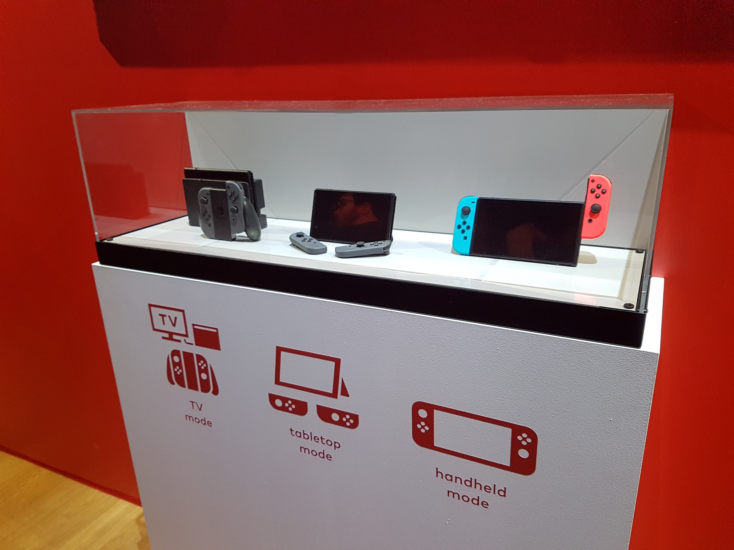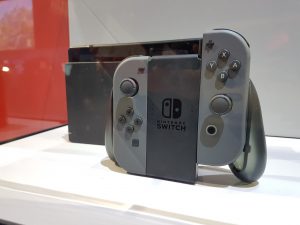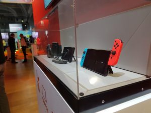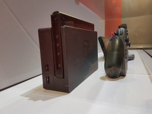 Avant d’essayer les titres de la Switch, nous avons pu observer la console sous toutes ses coutures. Et il faut avouer que visuellement, nous avons un produit assez joli qui, comme nous avons déjà pu le voir auparavant, tranche au niveau du design. Les trois différentes manières de l’utiliser nous sont directement présentées en vitrine avec la station d’accueil sur la TV, le mode portable et avec les Joy-Con (fameuses manettes) détachés. Le principe est de rappeler une fois encore qu’il s’agit d’une manière inédite d’aborder le jeu vidéo.