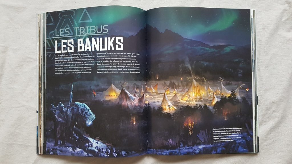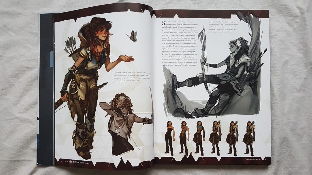 Nous en parlions au-dessus, l’Art de Horizon Zero Dawn est un excellent complément au jeu vidéo pour deux raisons. Dans un premier temps, il permet d’obtenir des images inédites de pré-production pour les personnages ou lieux iconiques, certains ayant inspirés la réalisation de panoramas bluffants in-game. L’ouvrage est d’ailleurs extrêmement bien coupé, avec un fil conducteur basé sur des thématiques, parmi lesquelles nous pouvons – par exemple – retrouver les tribus, les types d’activités ou les PNJ rencontrés. Attention ceci-dit à ne pas savourer trop vite l’ouvrage si vous n’avez pas encore terminé l’histoire, l’artbook s’étalant sur tous les éléments majeurs de l’aventure.