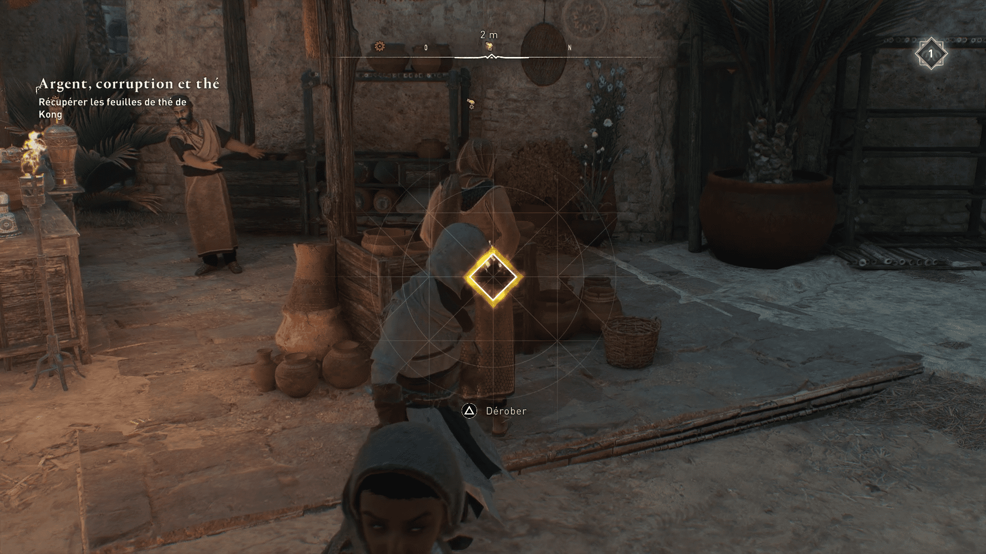 Pour ce qui est des autres possibilités de gameplay, nous pouvons toujours marquer notre ennemi à partir d’un oiseau qui fera le tour des endroits surveillés. Attention cependant aux gardes archers qui détecteront rapidement votre compagnon ailé et qui vous empêcheront ce marquage. Basim possède également toute une panoplie d’objets utiles aux combats : couteaux de lancer ou bombes fumigènes seront de la partie. En plus de l’infiltration basique avec la vision d’aigle, il sera toujours nécessaire de tuer les traîtres de la ville de Bagdad faisant partie d’une mystérieuse entité. Durant notre session, nous avons dû nous rendre dans un bazar à la recherche d’indices concernant une vente aux enchères qui intéresserait un certain Trésorier. Vous l’aurez donc compris, il s’agit d’une mécanique déjà connue par les joueurs de l’opus précédent et suite à la recherche positive d’indices, vous allez pouvoir vous rapprocher de lui pour lui asséner le coup final. Un système toujours aussi immersif et vraiment très plaisant à utiliser tant l’ensemble de la démarche paraît crédible. Parmi les autres petites possibilités offertes par ce Assassin’s Creed Mirage, nous avons pu voler de pauvres habitants qui n’ont rien demandé : mais contrairement aux opus précédent, un petit QTE vous est proposé. Plus la valeur est l’objet volé est importante, plus votre timing devra être précis sous peine d’alerter les gardes. Il en va de même concernant le système de réputation qui est toujours présent, mais qui pourra être abaissé en déchirant des affiches disséminées un peu partout dans la ville ou en payant des personnes qui plaideront votre cause auprès des citoyens.