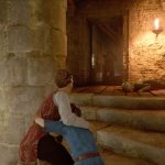 En effet durant ces deux premières heures de jeu, nous n’avons remarqué aucun choix proposé au joueur, il semble donc que vous devrez suivre simplement l’aventure. Comme nous allons le développer plus bas, le soft fournira de nombreuses phases d’infiltration. Ce qui vient encore une fois à servir la narration par l’utilisation, pour les moins pressés, de dialogues approfondissant la compréhension de certain(s) lieu(x) ou personnage(s). Enfin, A Plague Tale: Innocence est une quête initiatique. En effet, les deux protagonistes Amicia et Hugo sont livrés à un monde empreint à une violence devenue quasi naturelle. Cela offrira des scènes d’une rare brutalité une fois reposées dans le contexte de l’enfance, où l’innocence viendra se faire balayer par la survie et la mort. Un choix de lecture offert par les scénaristes qui viendra amplifier les moments d’interaction d’Amicia et d’Hugo, qui apprendront à la fois l’un sur l’autre, mais l’un de l’autre, particulièrement pour Hugo, qui rien que dans les trois premiers chapitres, semble montrer des signes d’évolution : il pose des questions sur son environnement ou encore n’hésitera pas à s’émanciper d’Amicia quelques instants pour l’aider.