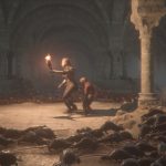 Tout aussi dirigiste, le gameplay se montre clair et efficace. Vous contrôlerez Amicia directement et Hugo indirectement, par le biais d’ordres très simples. Le soft enchaînera les séquences de découverte, où vous pourrez déambuler dans des couloirs main dans la main avec Hugo, avec des scènes de poursuite ou de discrétion. Amicia, qui peut sembler faible physiquement se montre habile à la fronde, arme qu’elle maîtrise à la perfection, et pourra s’en servir pour attirer ou assommer ses opposants, voir jusqu’à tuer. A Plague Tale: Innocence exploitera d’ailleurs cette mécanique sous divers aspects : décrocher des objets, retirer l’armure d’un boss, ou bien encore bêtement comme jeu d’adresse, la fronde se montre curieusement très agréable à utiliser. En plus de cela, elle pourra compter sur son lancer de pierre à la main, quand la discrétion est souhaitée, à la différence de la fronde cela n’affectera pas les ennemis, mais pourra les attirer à des endroits précis. Autre mécanique importante du jeu, les rats propagateurs de peste et voraces comme jamais, ces rongeurs hanteront votre aventure. Danger mortel, ces derniers ne craignent qu’une chose, la lumière. Il faudra donc gérer cet aspect avec vos protagonistes. Le feu sera votre meilleur ami, et cela se réglera souvent par des énigmes de logique assez simples. Pour vous aider, vous trouverez de nombreuses torches qui éclaireront votre passage, portées à la main elles peuvent même raviver un brasero éteint, cependant attention ! Certaines torches ont un temps d’embrasement, il faudra donc faire vite, sous lequel cas vous nourrirez les voraces. Malheureusement pendant ce court extrait, les rats n’ont finalement pas montré un danger si important, les scènes avec ces derniers, bien que très dérangeantes visuellement, sont assez génériques une fois la manette en main.