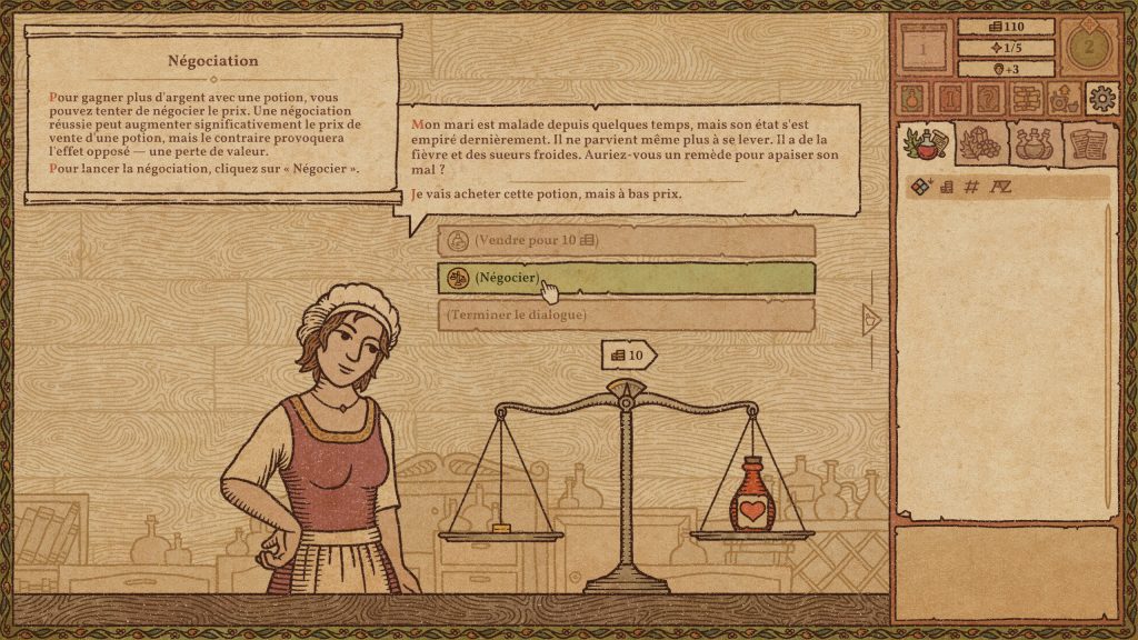Une fois dans le laboratoire et la journée commencée, des clients pointeront le bout de leur nez et vous demanderont des potions bien particulières. Par exemple, l’un vous demandera une potion de santé basique alors qu’un autre aura besoin d’une concoction afin de défaire un ennemi de type glace. Dans certains cas, les descriptions des clients sont assez claires alors que d’autres fois, il faudra se creuser un peu les méninges afin de trouver la solution et la potion adéquate à leur souhait. Une difficulté donc équilibrée et qui demandera, de temps en temps, de bonnes minutes de réflexion et de logique. Néanmoins, une fois que le client a émis son souhait, il faut se mettre au travail : dans le laboratoire, il faudra mélanger les ingrédients (fleurs et plantes dans l’inventaire) afin de fabriquer la bonne potion (comme vous pourrez le constater dans la vidéo de gameplay ci-dessous comprenant le didacticiel).