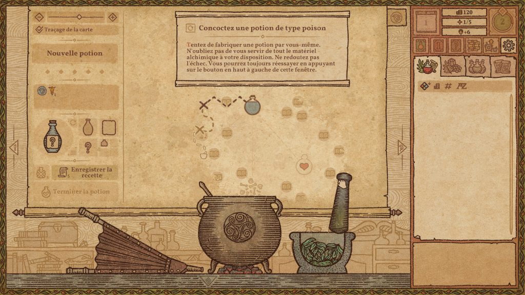 Pour cela, Potion Craft pimente l’aventure en demandant aux joueurs d’utiliser les ingrédients et les ustensiles à bon escient afin de dessiner un chemin sur une carte plus ou moins grande. Pour faire au plus simple et compréhensible, il convient de savoir qu’en écrasant une plante en particulier, vous formerez une trajectoire sur la dite carte. En mettant cette plante dans le chaudron et en mélangeant la texture, vous formerez un autre segment de chemin. Chaque plante et fleur proposant sa propre trajectoire. Évidemment, l’idée est de devoir mélanger plusieurs éléments alchimiques ensemble. Le principal objectif étant de parvenir à atteindre un cercle représentant la potion souhaitée. Notez que la carte se déploie et se montre de jour en jour, ce qui vous permet de vous repérer plus facilement au fil du temps. Les emplacements de potions déjà découverts restent visibles de jour en jour.