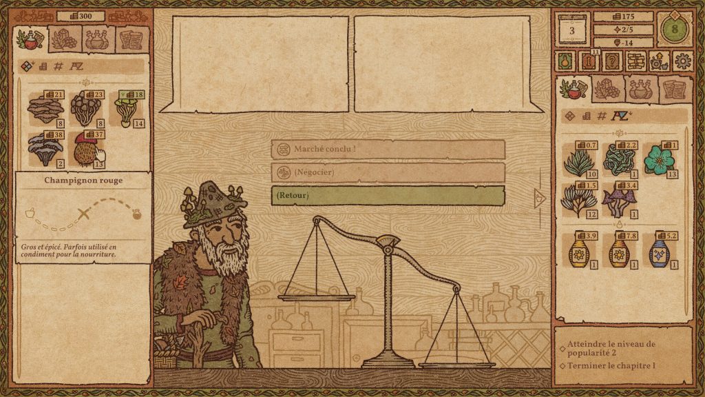 Avant de conclure, permettons nous un mot sur la technique même du titre. Comme vous avez pu le lire précédemment, nous avons essayé le titre selon sa version Early Access et sur PC. De notre côté, nous n’avons absolument pas expérimenté de soucis divers, tels que le clipping, l’aliasing, des ralentissements ou bien des crash d’application. Que très peu gourmand en ressources et en espace de stockage, Potion Craft est déjà stable à l’heure actuelle et aucune ombre technique ne devrait se glisser durant vos préparations alchimiques. Un bon point, évidemment. On espère tout de même que les développeurs ajouteront du contenu significatif à leur titre afin de diversifier encore plus l’expérience et surtout lui donner un peu plus de punch et de profondeur.