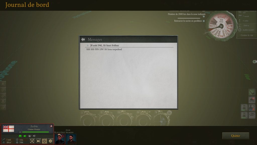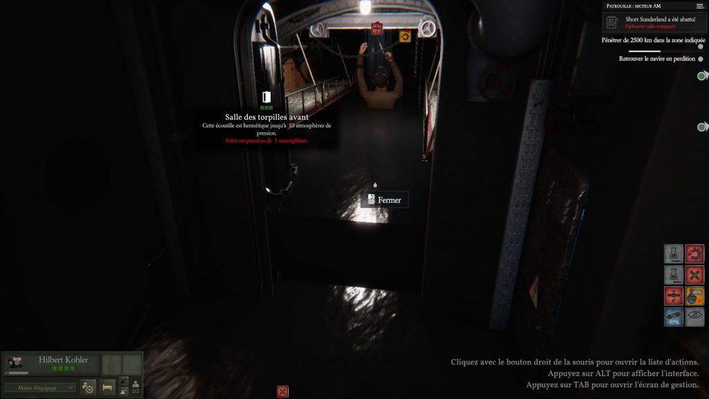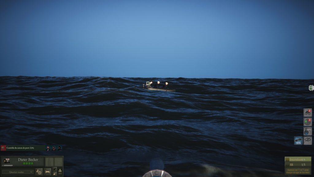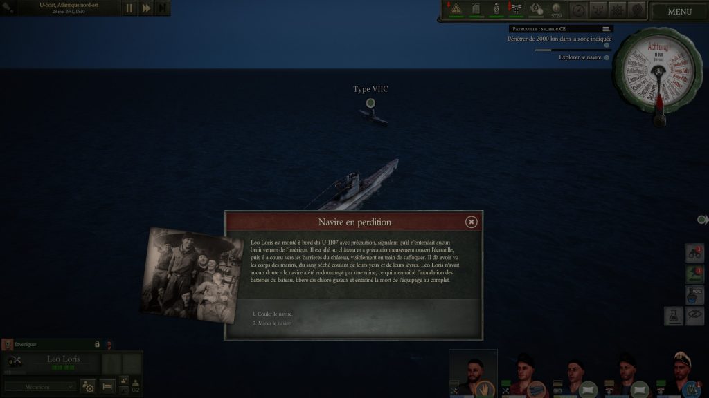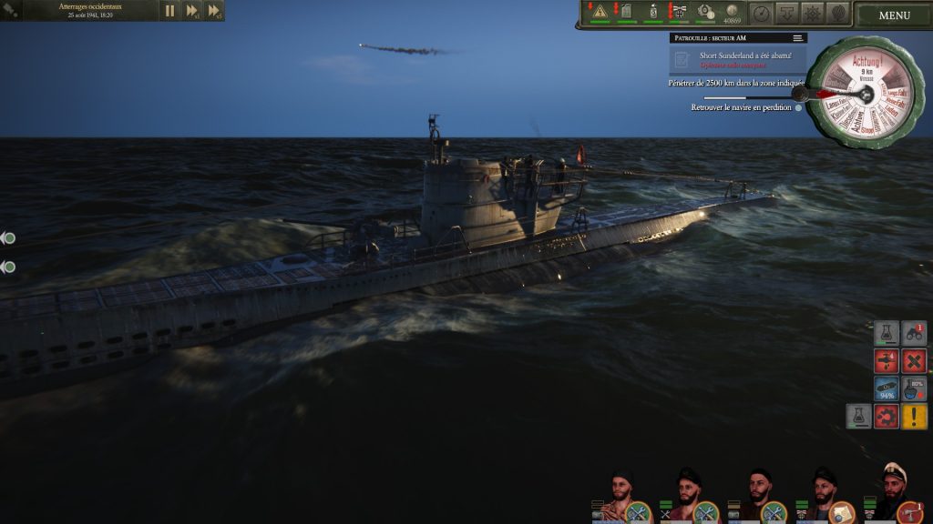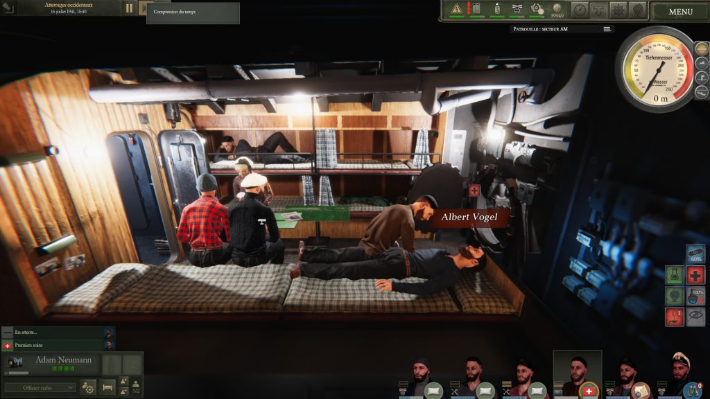 Après un court tutoriel qui apprend les rudiments afin de s’en sortir, UBOAT plonge directement ses joueurs dans le grand bain, quitte à les laisser balbutier. Un submersible, un équipage, une casquette de capitaine, des ordres et une tape dans le dos plus tard vous voilà maître du U-96 en 1940. À vous d’en faire bon usage pour couler autant de tonnages que possible. Si ce n’est pas le contexte qui vient à marquer la différence, c’est donc du côté du gameplay qu’UBOAT cherche à séduire son public. Mélangeant simulation, gestion et survie, le soft déploie deux possibilités de style de jeu pour convenir à tout le monde. D’un côté le néophyte qui souhaite profiter du contexte de cette époque en gérant son uboot, de l’autre le vieux loup de mer qui fait de la trigonométrie plus vite que son ombre. Pour obtenir ce résultat, Deep Water Studio a accentué le côté gestion en l’abordant à l’équipage. Afin que votre sous-marin soit pleinement opérationnel, différents postes sont à occuper par vos officiers : la radio, le sonar, la navigation, la vigie, les moteurs ou encore la préparation des torpilles. Dans les faits, si votre officier en charge de la navigation doit se coucher, cela fera qu’après un laps de temps, votre sous-marin sera « perdu » en mer, et ne sera plus visible sur la carte monde. Il faut donc organiser les 3-8 de façon à garder un moral assez haut pour éviter les crises de panique pendant les affrontements, tout en ayant les principaux postes de travail toujours actifs. Autre facteur à vigilance, la gestion des biens que votre navire transporte. Les munitions, les armes, la nourriture et autres torpilles sont à garder aux bons endroits afin d’être optimaux au besoin, et surtout doivent être achetés et réapprovisionnés.