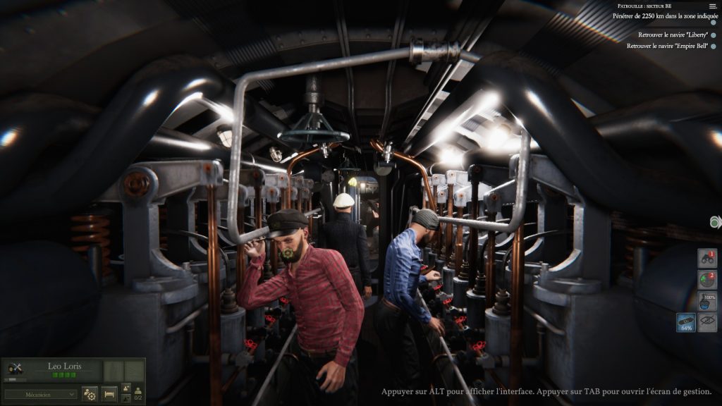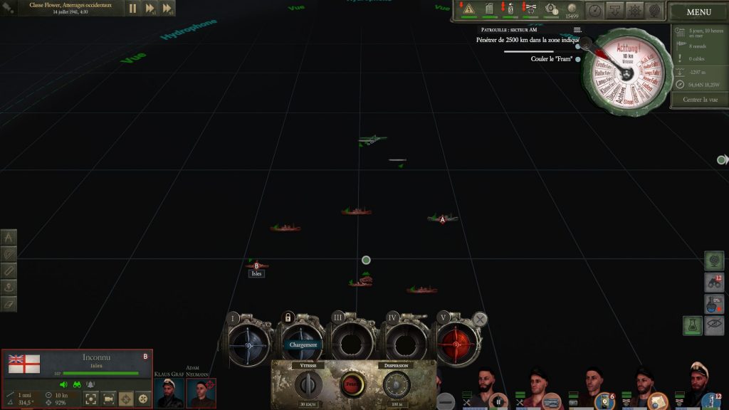 Il est malvenu d’être à court de carburant ou de nourriture au milieu de l’océan. Pour ce qui est de la navigation, UBOAT opte pour un système classique, qui n’est pas sans rappeler Silent Hunter. Ainsi, votre navire avancera de point en point que vous prédéterminez d’un simple clic droit sans ne jamais en dévier, sauf si votre navigateur tape une petite roupille bien entendu. C’est pendant les phases d’attaque que les choses sérieuses commencent. Deux options s’offrent à vous : laisser l’officier de pont cibler les bateaux ou prendre le rôle de ce dernier et calculer votre tir. Pour ce dernier choix, tout l’attirail du parfait capitaine est disponible : livre d’identification, télémètre stadimétrique, chronomètre et la trajectoire. Autre idée bienvenue de Deep Water Studio, le jeu n’ayant pas de mode de difficulté ou d’options pour régler le degré de simulation que vous souhaitez, il faudra passer par un officier pour effectuer l’action que vous voulez réaliser vous même. Or si vous restez en vue extérieure ou de tranche de votre sous-marin, tout se fera à la manière d’un RTS classique. Par ailleurs, une pause active est disponible et vous aidera à gérer les crises avec fluidité ! Car en effet, si dans l’imaginaire faire plonger un sous-marin est simple, dans la pratique c’est tout un exercice d’organisation ! Ouvrir la valve pour inonder les ballastes, passer la lumière interne au bleu, dire aux pilotes de s’installer au poste adéquat, dire à l’officier de pont de prendre le périscope, et nous en passons. Et une fois cela bien pris en main, il faut se l’avouer c’est très agréable de voir ses petits marins courir dans la coursive pour effectuer l’action. Vous l’aurez compris, l’idée centrale pour réussir dans UBOAT est l’organisation.