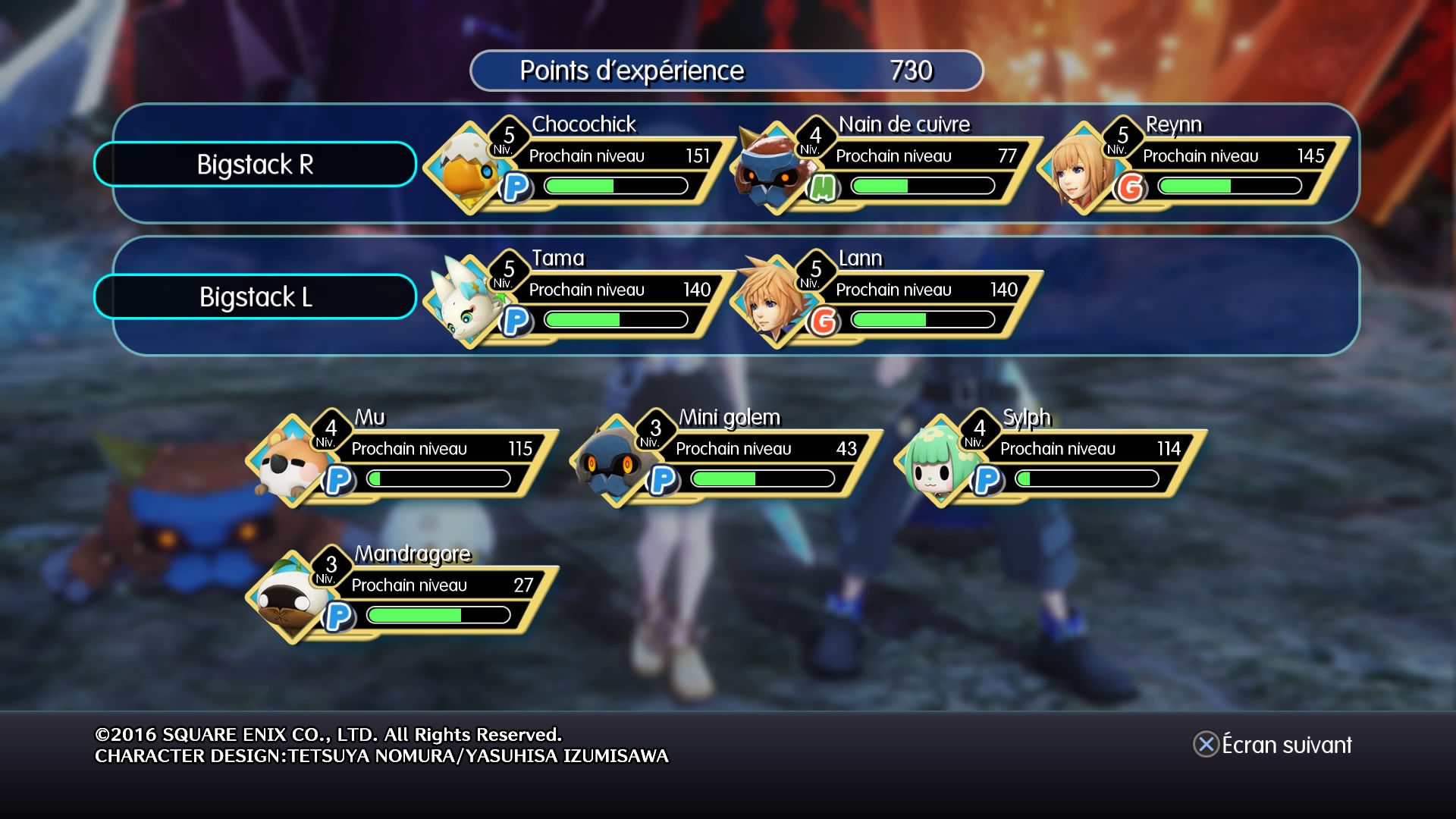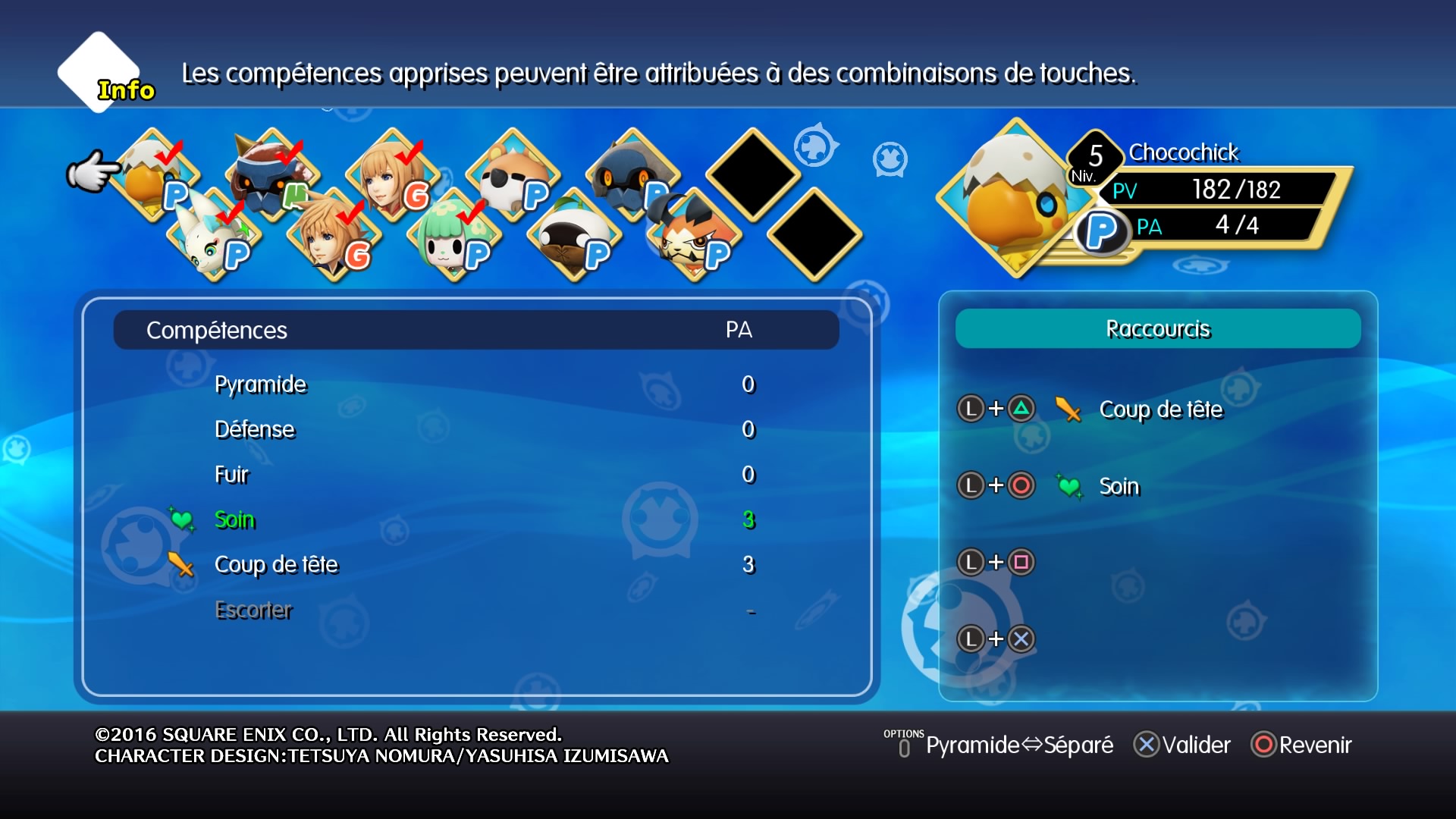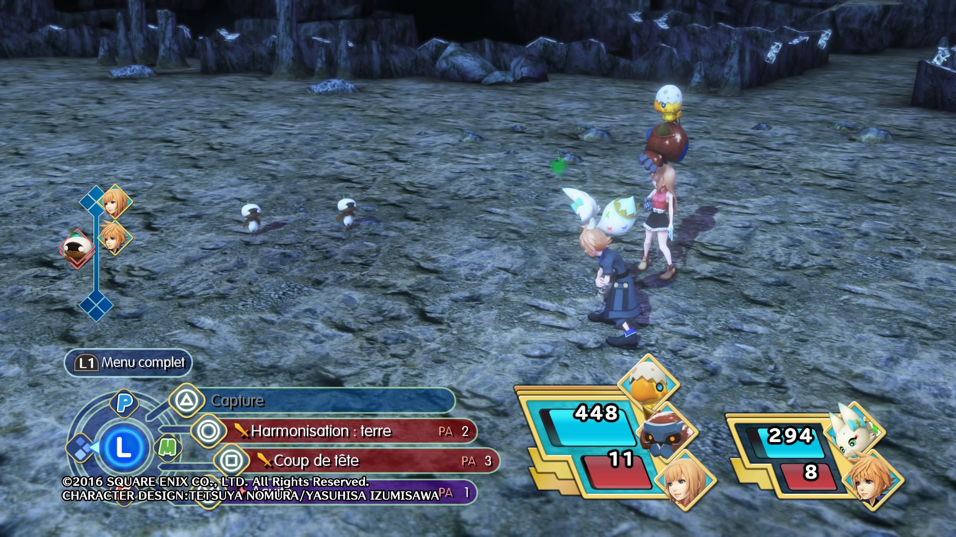 Mais en creusant un peu, on s’aperçoit que ce spin-off a bien plus à offrir que des personnages attachants et un monde coloré dans lequel des évènements relativement graves dans les faits prennent une ampleur bien moindre. En marge du système de combat qui ne dépaysera pas les initiés des opus postérieurs à l’épisode X, se trouve l’essence même de ce World of Final Fantasy. Et c’est probablement ce qui risque fort de séduire et d’accrocher les joueurs. En effet, en passant par le menu de formation, il est possible de créer des pyramides constituées d’un de nos deux héros et de 2 Myrages maximum. Les statistiques de PV, PA, Force, Défense etc, son additionnées et permettent donc de palier aux faiblesses de certaines de nos unités. Et puisque l’on peu défaire et refaire ses pyramides autant que bon nous semble en combat, cela offre une certaine adaptabilité au joueur.