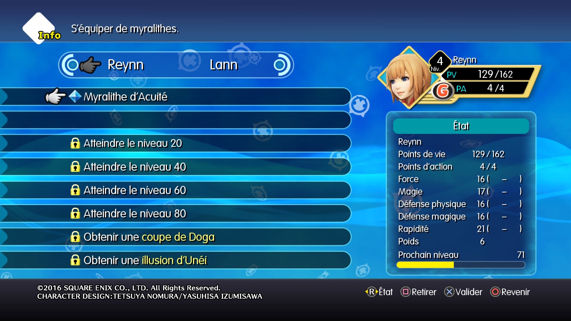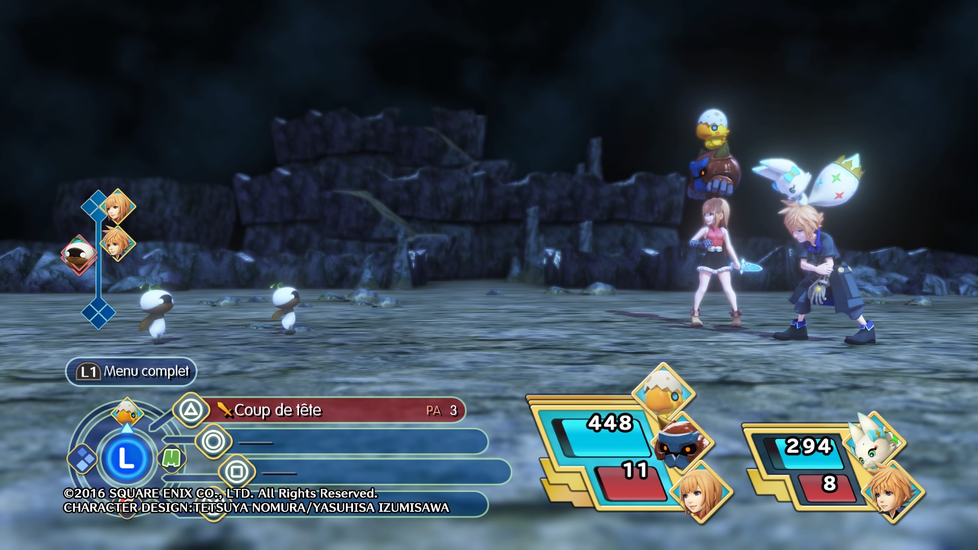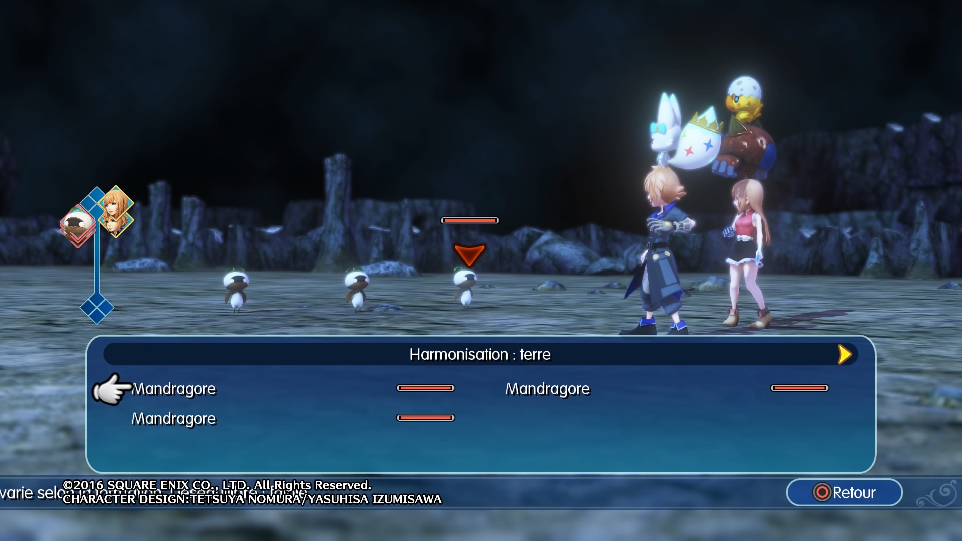 Mais en creusant un peu, on s’aperçoit que ce spin-off a bien plus à offrir que des personnages attachants et un monde coloré dans lequel des évènements relativement graves dans les faits prennent une ampleur bien moindre. En marge du système de combat qui ne dépaysera pas les initiés des opus postérieurs à l’épisode X, se trouve l’essence même de ce World of Final Fantasy. Et c’est probablement ce qui risque fort de séduire et d’accrocher les joueurs. En effet, en passant par le menu de formation, il est possible de créer des pyramides constituées d’un de nos deux héros et de 2 Myrages maximum. Les statistiques de PV, PA, Force, Défense etc, son additionnées et permettent donc de palier aux faiblesses de certaines de nos unités. Et puisque l’on peu défaire et refaire ses pyramides autant que bon nous semble en combat, cela offre une certaine adaptabilité au joueur.