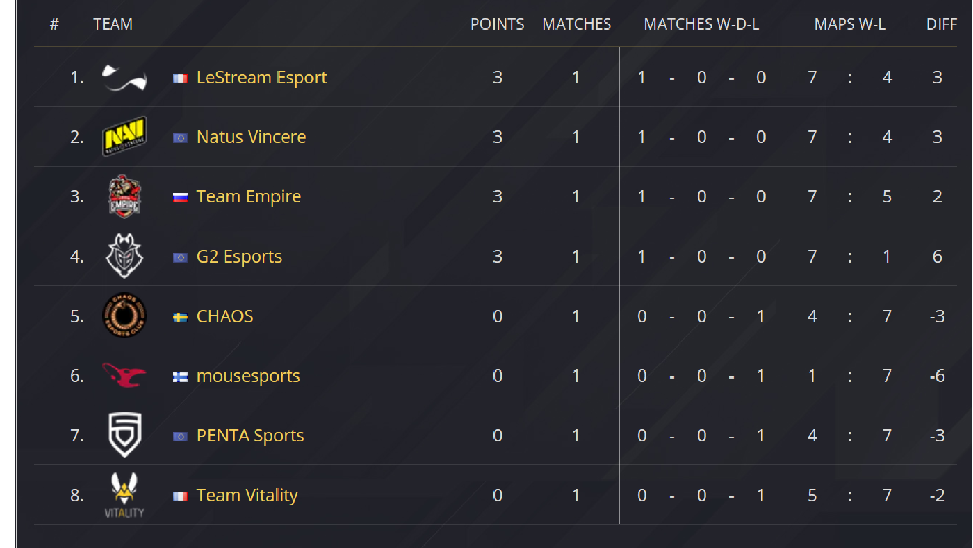 Pour le premier match de cette première journée, PENTA Sports ont affronté les joueurs de Natus Vincere. Le match s’est déroulé sur Café Dostoyevsky et a joué en faveur de Natus Vincere qui remportent le match sur le score de 7-4. Ensuite, les joueurs de G2 Esports ont défié ceux de mousesports également sur Café Dostoyevsky. G2 Esports, avec l’arrivée du joueur finlandais UUNO, reprennent la compétition en mains en remportant ce match sur le score de 7-1. Pour le troisième match, les joueurs de LeStream Esport ont rencontré les joueurs de Chaos Esports Club, toujours sur Café Dostoyevsky. Cette rencontre s’est terminée sur le score de 7-4 en faveur de LeStream Esport. Pour clôturer cette journée de reprise, le duel s’est déroulé sur Café Dostoyevsky et opposait les joueurs de la Team Vitality face à la Team Empire. Ces derniers se sont imposés sur le score de 7-5.