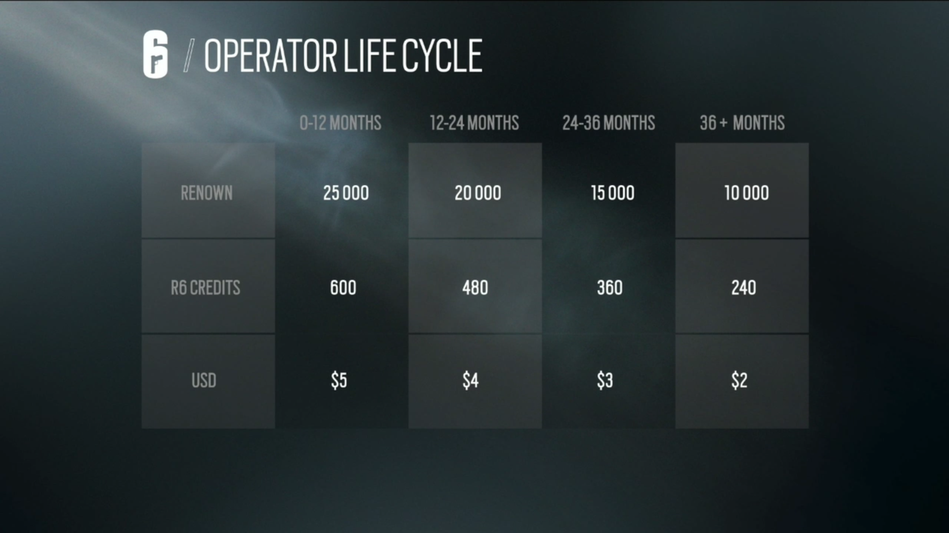 En outre, des changements in-game seront apportés sur quelques agents et équipements, que nous avions évoqué quelques jours auparavant dans cet article. D’autres modifications ont été annoncés lors de cette présentation, comme le retrait du flapping sur PC, le fait de se pencher de droite à gauche très rapidement, celui-ci ne sera donc plus possible. L’holographique subira également une petite modification, son contour ne sera plus beige mais noir. Vous le savez sûrement, Rainbow Six Siege connaît de nombreuses éditions différentes en fonction du nombre d’agent fournis avec le jeu de base. De ce fait, La Starter Edition sera retirée et remplacée par la Standard Edition, disponible au même prix que la Starter Edition. Les développeurs s’assurent également que le gain de renommée sera plus facile et diminuera le prix des agents en fonction de leur date de sortie (détails dans le tableau ci-dessous).