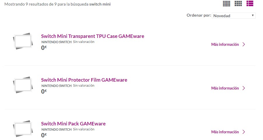 Les distributeurs en question, ce sont Amazon et GAME, les branches anglaise et espagnole pour être tout à fait exact. En effet, si vous recherchez Switch Mini dans leurs barres de recherche, notamment avec les mentions de protections d’écran, vous pouvez tombez sur des exemples comme celui-ci :