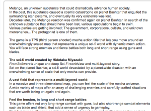 - Hidetaka Miyazaki, qu’on ne présente plus, serait derrière la création du monde. L’action prendrait place sur Bashtar, une planète dévastée par un désastre sans précédent à cause de Melange, une étrange substance qui pourrait faire avancer l’espèce humaine malgré sa dangerosité. C’est pourquoi elle est recherchée par divers gouvernements, compagnies, cultes et mercenaires.