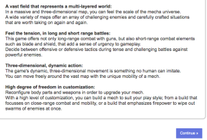 - Beaucoup de customisation, que ce soit pour les armes ou le mécha. Ainsi, les joueurs pourraient se spécialiser dans les combats à distance ou ceux au corps-à-corps.