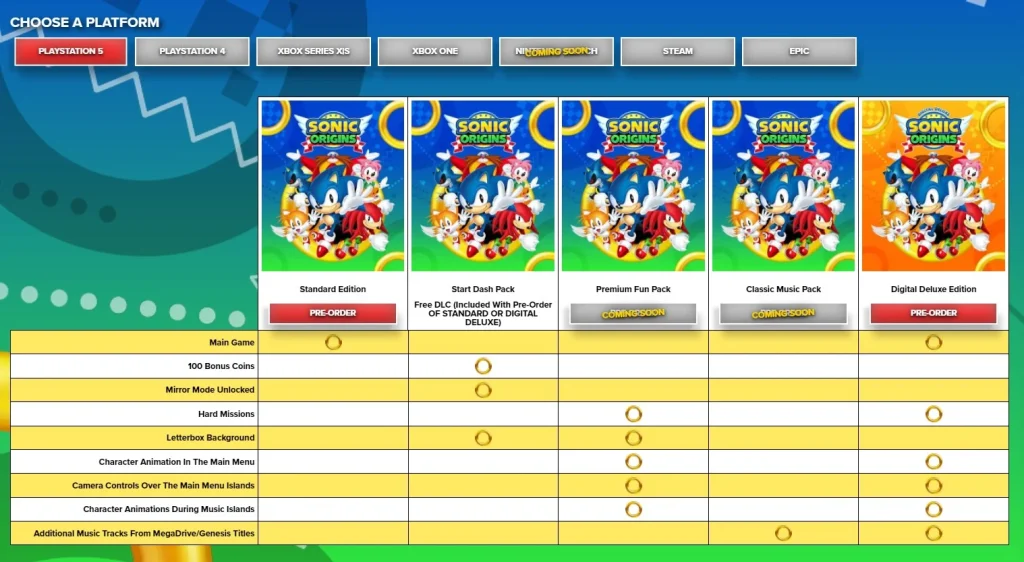 SEGA a confirmé la présence de DLC pour Sonic Origins. En effet, certains modes, features et même des éléments visuels ne seront accessible que par l’acquisition de contenu téléchargeable. Sur le site officiel du jeu, il est possible de découvrir les diverses éditions disponibles à l’achat ainsi que différents packs.