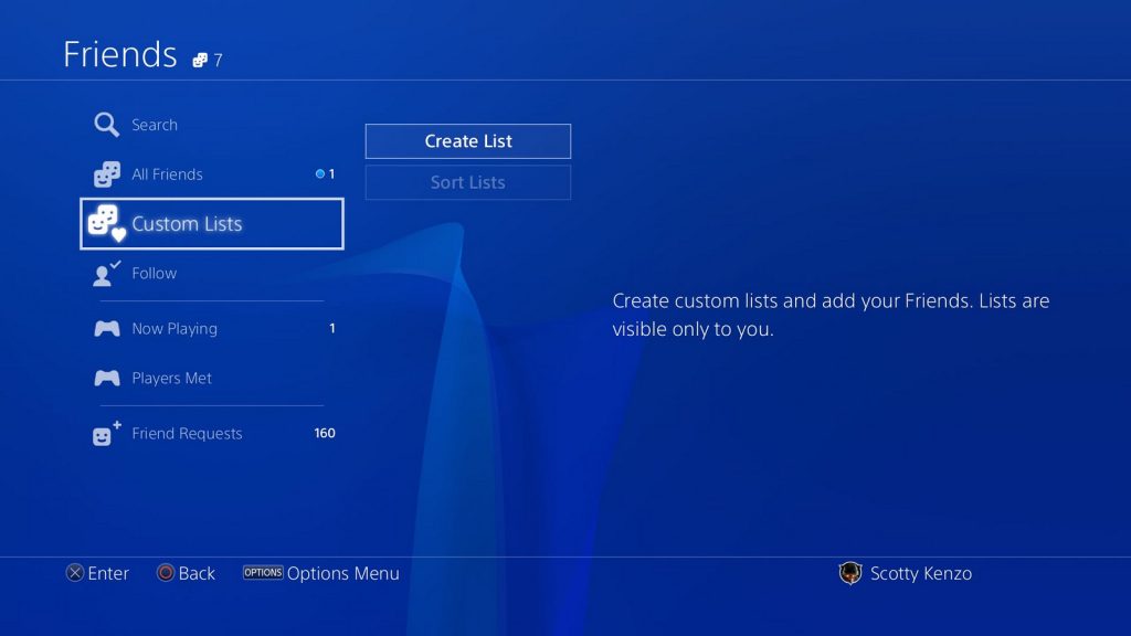 - Gestion de la liste d’amis : Il y a à présent un onglet « listes personnalisées » sur l’écran « Amis » du menu. Il sera donc possible de classer vos amis dans des groupes spécifiques, comme par exemple les classer par jeux pour vos parties en multi.