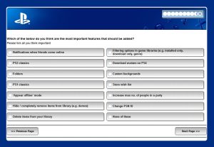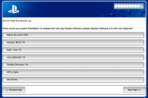 Un utilisateur de NeoGAF a partagé plusieurs captures d’écran d’un sondage que réalise actuellement Sony aux USA. Parmi les questions, l’une d’elles demande à quelle période les joueurs espèrent voir arriver la mise à jour 4.0, ainsi que les principales fonctionnalités qu’ils souhaiteraient voir débarquer prochainement.