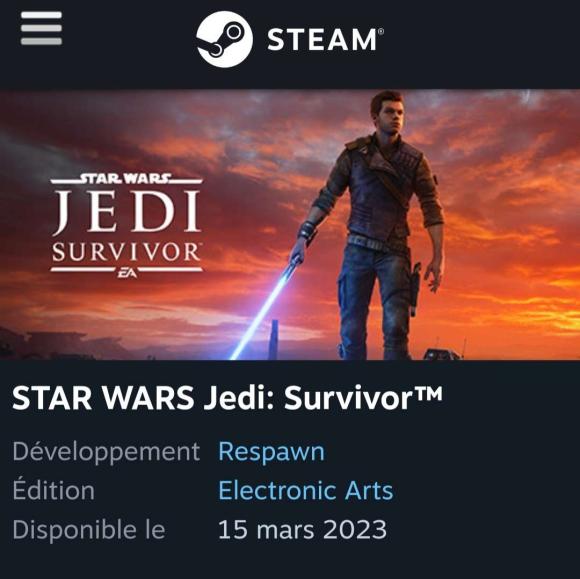 À quelques jours des Game Awards 2022, les rumeurs et les fuites s’enchainent et aujourd’hui, une faute de Steam a permis d’avoir davantage de renseignements sur Star Wars Jedi: Survivor. Prévu sur PC, PS5 et Xbox Series X|S, le nouveau projet de Respawn Entertainment ayant lieu dans une galaxie lointaine sortira donc comme prévu en mars 2023, plus précisément le 15 mars chez nous. On a même une petite capture d’écran de la version mobile de Steam pour le prouver, maintenant que la page a été mise à jour :