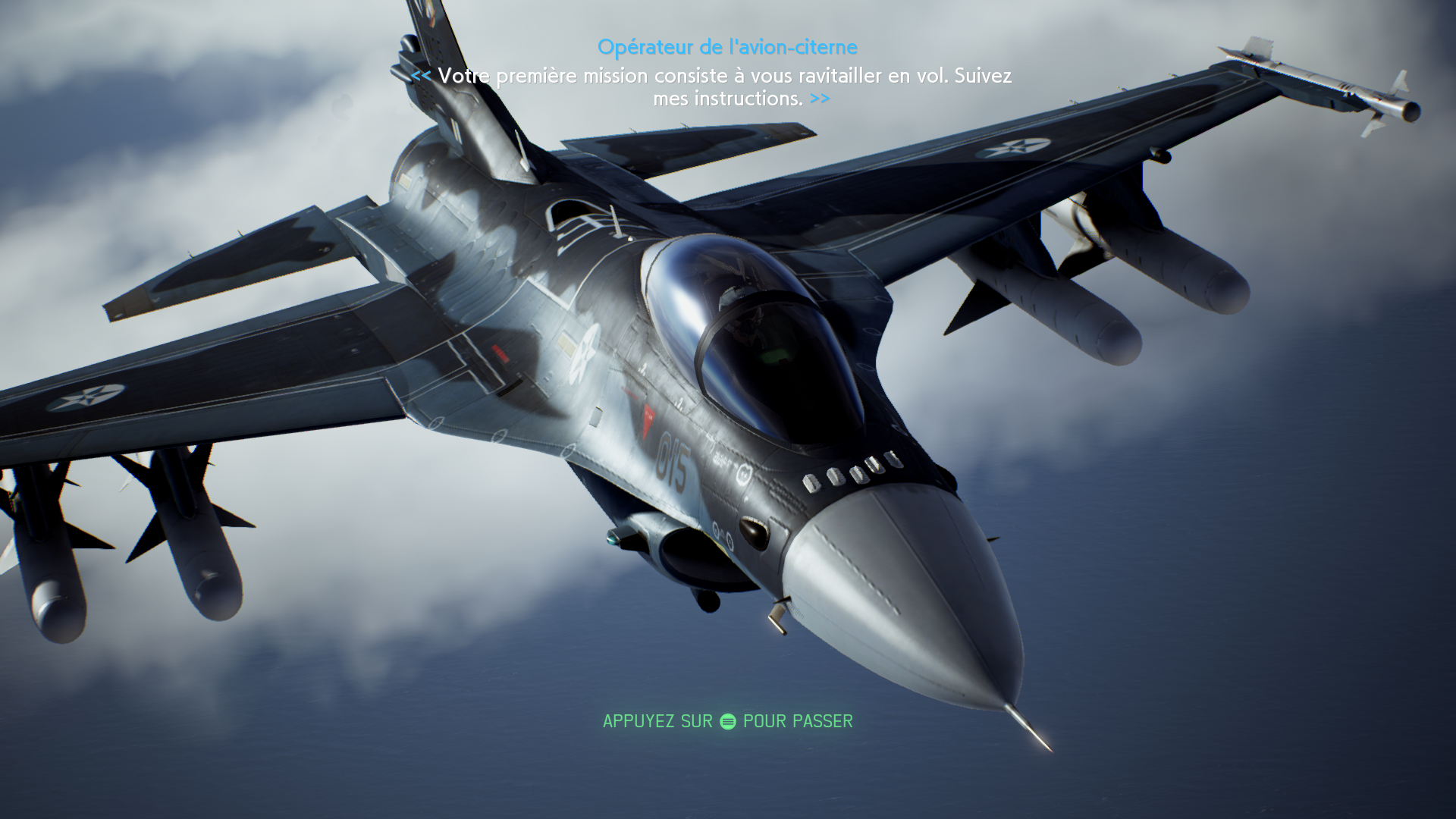 Enfin bon, une fois votre choix effectué que vous êtes dans les airs, le véritable jeu commence ! Comme dit plus tôt, Ace Combat 7: Skies Unknow comporte une vingtaine de missions, offrant des objectifs variés ; du simple conflit aérien, à la protection d’une cible en passant par l’affrontement de boss. Le jeu jouera également sur son style, obligeant le joueur à parfois être d’une discrétion absolue, parfois être la quintessence d’un florilège d’explosions. Tout ça pour en arriver à une conclusion véritablement unique à chaque mission. Mais ce dernier né de la saga Ace Combat ne s’arrête pas en si bon chemin. En effet, un nouvel élément de gameplay viendra perturber votre progression. Ils sont partout, ignorent les frontières et font le beau comme le mauvais temps : les nuages ont maintenant un impact certain sur votre mission. Si à l’époque plonger dans une couche nuageuse était sans risque, il faudra maintenant composer avec cette variante pour espérer s’en sortir sur le champ de bataille. En effet, ces derniers, en plus de boucher la visibilité, obligeant donc la navigation aux instruments, pourront également impacter les performances de votre avion en le soulevant, en gelant, ou bien carrément pendant un orage, vous mettre un coup d’jus qui viendra brouiller tout l’ATH de votre appareil. Une nouveauté bienvenue, qui vient se cumuler aux objectifs de mission et ainsi offre un véritable défi en jeu. Après chaque mission, un rang vous sera donné et ce dernier vos créditera de PAM, une monnaie virtuelle. Cet argent vous permettra de débloquer dans un arbre technologique des avions, des armes ou encore des améliorations. Pour simplifier cet arbre, Namco a décidé de le scinder en trois gros axes : le premier qui viendra à faire débloquer les avions américains (F-16, F-15 et ses variantes, jusqu’au YF-23), le second quant à lui s’axera sur des avions européens (Mirage, Rafale, Gripen, Typhoon), enfin la dernière branche prendra les avions russes (MiG-31B, SU-33, SU-57, SU-47). Bien que les branches soient interconnectées par endroits, il faudra tout de même se focaliser sur une au lieu de s’éparpiller. En effet, pour débloquer un avion il faut posséder toutes les améliorations ainsi que l’avion précédent ce dernier, ce qui vient à se traduire de la façon suivante, si vous voulez débloquer le F/A-18F il faudra au préalable avoir déjà débloqué le F-14D ainsi qu’une amélioration sur le chemin. Pour gagner des points PAM il faudra bien entendu jouer, en solo ou en multijoueur. Cependant, si après la campagne vous aurez déjà débloqué un axe de l’arbre technologique sans trop de problèmes, les deux autres seront quant à eux à farmer à la dure.