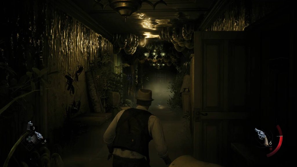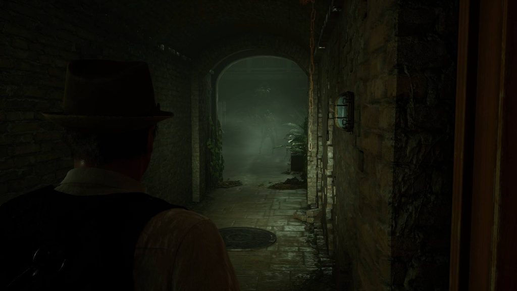 C’est après une très belle cinématique nous plongeant dans les années 20, accompagnée d’une douce musique jazzy, que nous avons décidé de prendre les traits d’Edward Carnby, interprété par l’acteur David Harbour, pour coller au mieux à l’expérience de l’opus original. Et première surprise, lors du choix de notre héros, le nom des acteurs interprétant les différents personnages y sont renseignés. Un détail très sympathique qui montre un réel respect envers ces derniers, mais aussi l’ensemble des participants au projet. Après avoir choisi notre enquêteur, il est temps d’ouvrir les portes du Manoir en passant par la petite trappe, non par la grande porte, et de nous plonger dans un long et tortueux labyrinthe psychique.