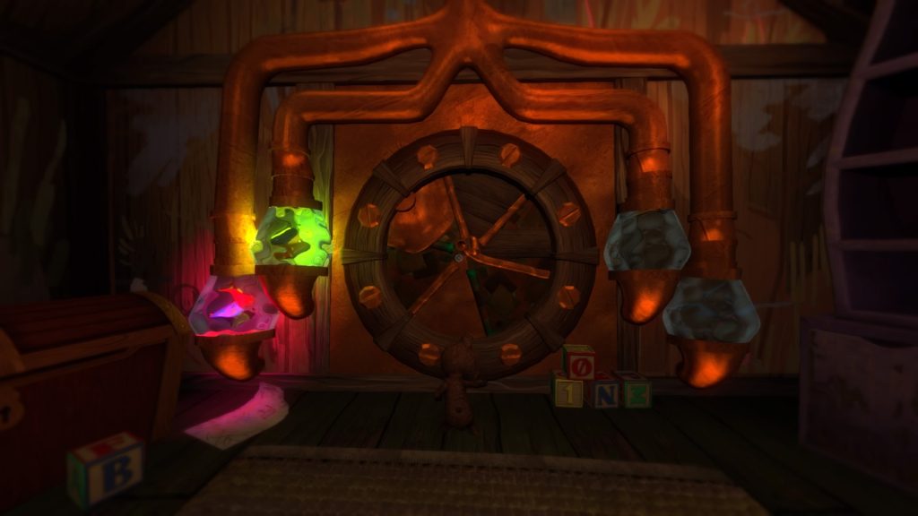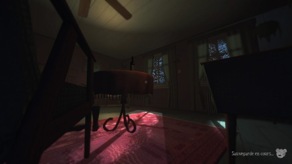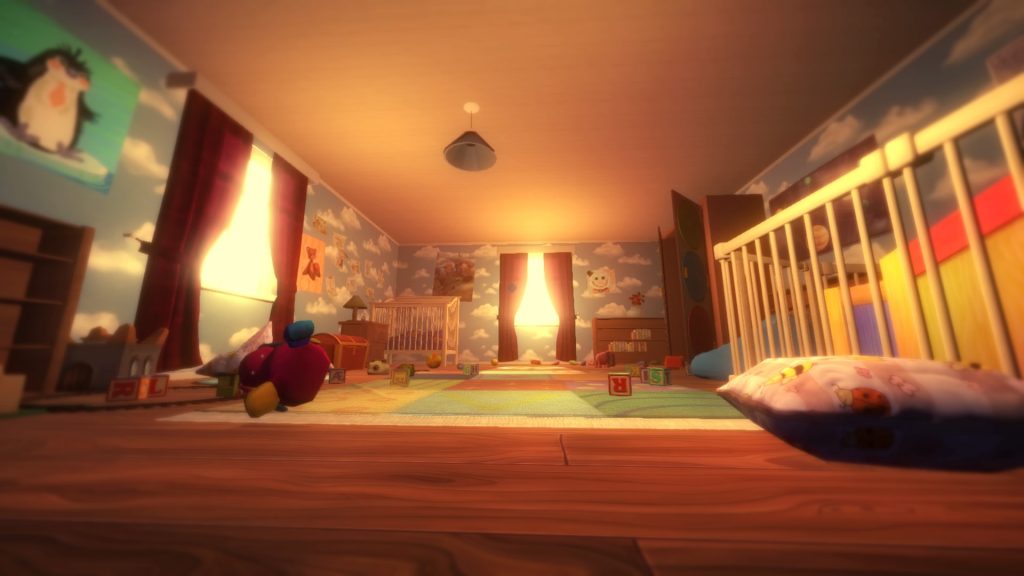 Une fois la nuit tombée, notre très jeune héroïne sera amenée à déambuler dans les couloirs de la maison qui ne semble plus aussi rassurante qu’avant. Il faut dire que la direction artistique enfantine peut faire sourire au premier abord. Mais une fois que la nuit reprend ses droits, on rigole tout de suite un peu moins. Force est de constater que dès les premières minutes passées dans la pénombre, tout est immédiatement plus effrayant. D’autant plus lorsque l’on se trouve dans la peau d’un bambin en grenouillère. Le rapport à l’environnement s’en retrouve complètement bouleversé et on se prend à sursauter gentiment au détour d’un salon peu accueillant une fois le soleil couché. Heureusement, notre charmante petite est accompagnée de son nouvel ami, qui, une fois serré dans ses bras, produit une légère source de lumière. Ce sera la seule présence chaleureuse que l’on aura tout au long du jeu, autant vous dire que l’on a connu mieux. Néanmoins, le jeu n’offrira que très rarement de réelles frayeurs. Les jumpscares sont peu nombreux et les faiblesses du titre, sur lesquelles nous reviendront plus tard, ne lui permettent pas de plonger le joueur dans la peur la plus totale, comme on l’aurait espérer. L’immersion du joueur est largement perfectible et on ose espérer que lors du passage en réalité virtuelle, le jeu saura faire grimper le trouillomètre.