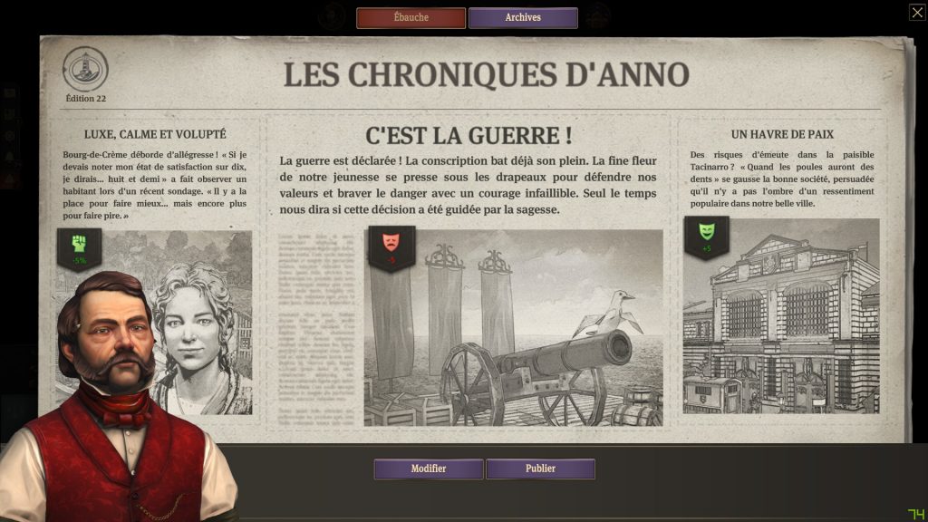 Enfin, énième nouveauté, mais pas des moindres, l’attrait de votre ville. Votre ville principale doit être belle, ceci est maintenant un atout considérable dans la progression de cette dernière. Effectivement, un indice d’influence fait son apparition. Cette influence vient à se gagner de différentes manières, par vos forces armées, la culture disponible dans votre ville (à noter l’arrivée du zoo, ainsi que du musée, le tout ayant des pièces/animaux à trouver pour embellir), par vos citoyens, etc. Elle vous permettra entre autres de pouvoir modifier le journal à votre avantage, ou bien d’acheter des améliorations spécifiques dans différents domaines. Oui, un journal sera également à votre disposition, ce dernier reléguant les informations de votre compagnie. Il vient jouer un rôle majeur, en apportant ou retirant du bonheur à vos habitants. Libre à vous de tronquer les informations compromettantes. Une explosion dans une usine ? Remplacez l’article par l’annonce d’un nouvel animal dans votre zoo, c’est toujours plus gai.