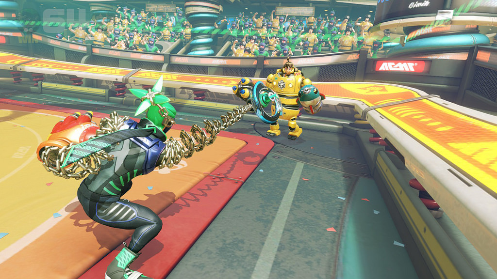 Il est important dans un premier temps de rassurer les parents sur ARMS. Même s’il s’agit de combat, le soft est en aucun cas violent et le sang n’est pas présent. Il s’agit vraiment d’un titre familial qui se joue entre amis ou en solo. Le principe est simple, mettre l’adversaire au tapis en lui donnant des coups de poing à l’aide de vos bras extensibles. À vous de bien esquiver, de gérer vos déplacements et d’envoyer votre attaque au bon moment. Comme les coups peuvent être donnés sur une longue distance, vous pouvez donner à vos attaques des effets pour surprendre votre adversaire. Avant chaque début de match, vous avez la possibilité de choisir quel gant de boxe vous souhaitez utiliser. Chaque poing a des propriétés distinctes comme le feu, l’électricité, les explosions etc… Vous pourrez ainsi congeler un adversaire avec le bras droit, puis l’électrocuter avec le gauche. Au début de l’aventure vous en aurez trois mais très vite vous en gagnerez davantage. Attention enfin, des attaques spéciales sont même disponibles pour renverser la situation.