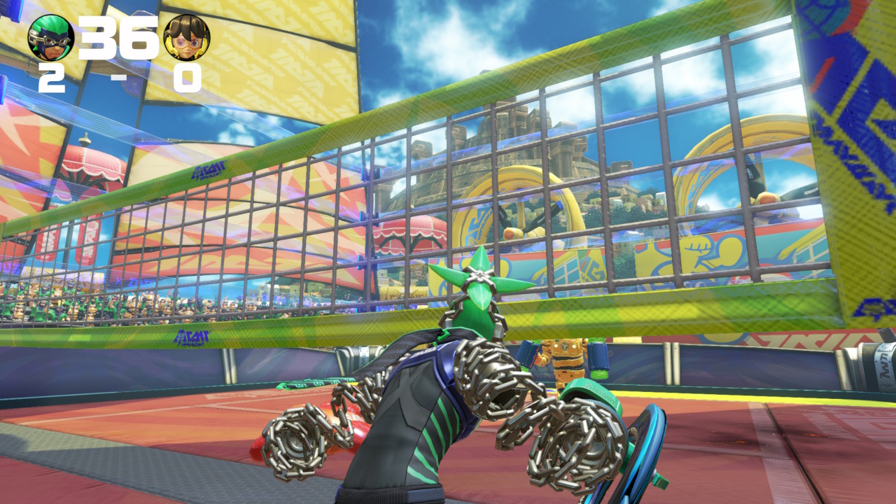 Arms dispose de plusieurs modes de jeu qui occuperont les joueurs de nombreuses heures. Le premier mode s’intitule Grand Prix. Celui-ci est assez classique car il suffira de gagner 10 combats à la suite en utilisant toujours le même personnage. Avant chaque match, les gants peuvent être choisis. Pour cette première épreuve, il est possible de choisir le niveau de difficulté qui varie de 1 à 7. Un premier mode rapide qui permet de bien progresser avec un personnage en particulier. Quant au second, il se nomme Versus et peut se jouer en multijoueur local jusqu’à quatre. Il s’agit de petits tournois rapides au cours desquels on peut affronter l’ordinateur sur tous les modes de jeu disponibles, et ce, également pour le volley ou le basket dont nous parlerons plus tard. Un autre mode proposé est le non classé. Celui-ci permet d’affronter des joueurs via un matchmaking en ligne. Vous pourrez ainsi faire du 1vs1 ou même du 2vs2 dans tous les modes que propose le soft. Une fois le Grand Prix terminé, le mode classé se débloquera. Comme son nom l’évoque, vos victoires et vos défaites influeront sur votre classement mondial vous forçant ainsi à toujours progresser. Bien évidemment le jeu proposera d’effectuer des parties privées avec ses amis dans la catégorie Entre amis que ce soit en local ou en ligne. Enfin, si Arms vous semble compliqué, un mode entrainement vous est proposé vous permettant rapidement de devenir un champion de boxe.