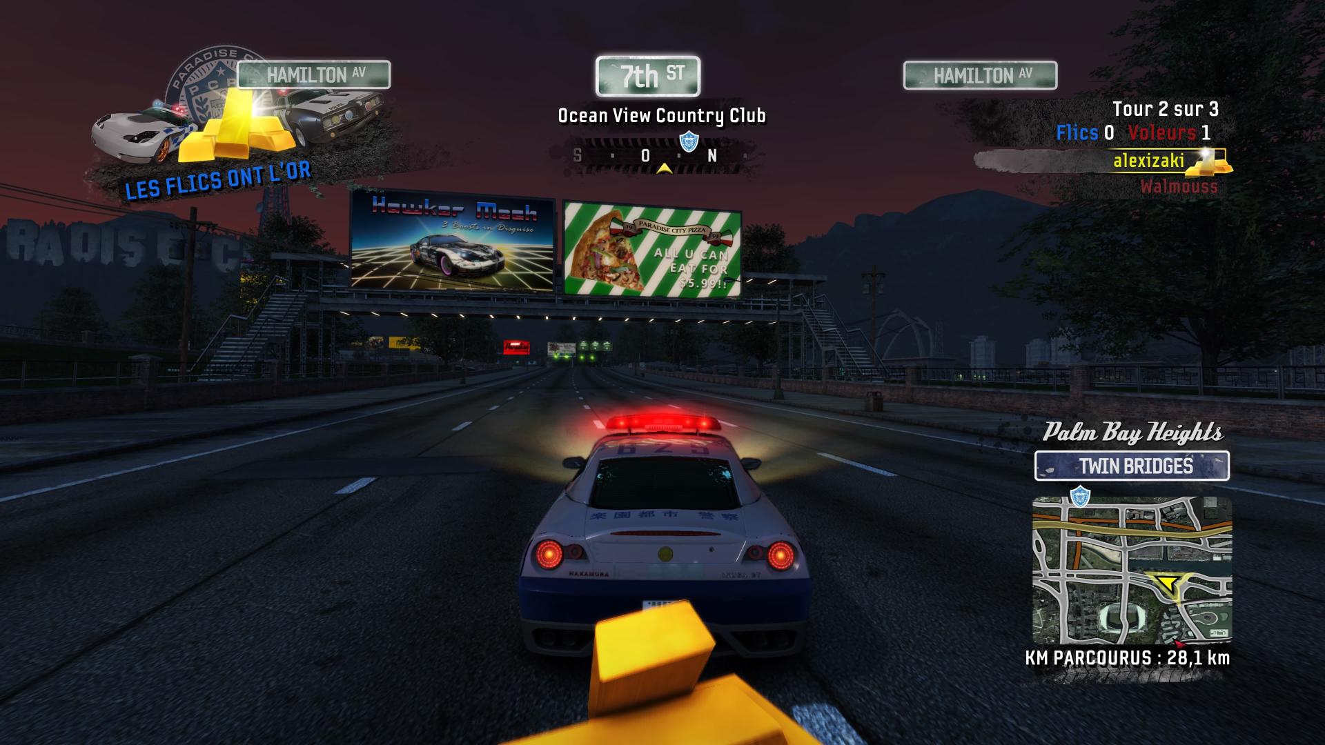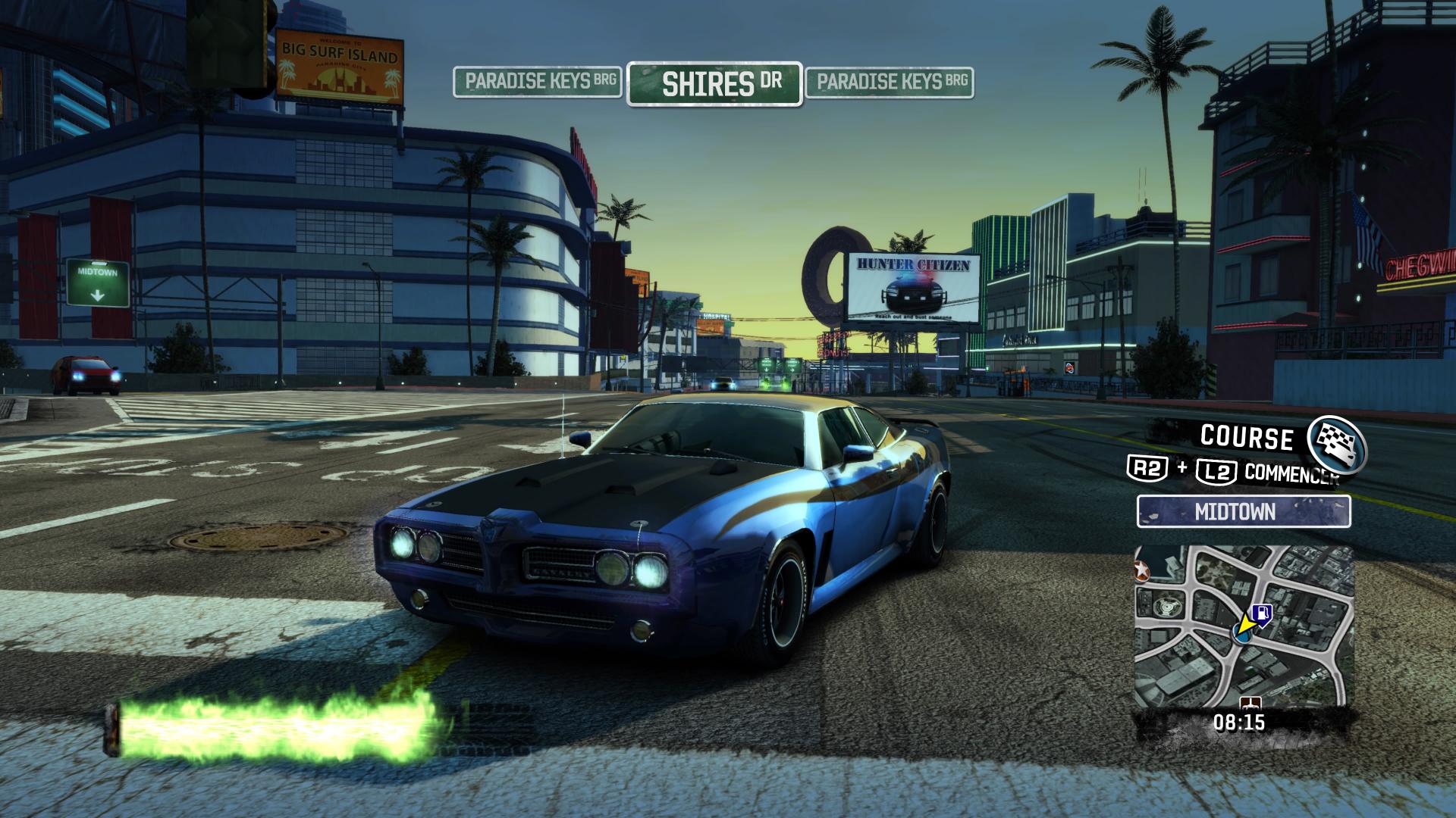Et quel plaisir de le retrouver tout beau, tout propre – du moins pour les joueurs consoles. Burnout Paradise Remastered, c’est le plaisir de retoucher à ce titre en 60 images par seconde (comme à l’époque, finalement), un critère très important pour une vitesse de défilement extrêmement rapide. En revanche, l’aspect visuel se voit désormais lissé et rehaussé pour atteindre une résolution optimisée 4K sur PS4 Pro et Xbox One X. Une différence qui saute aux yeux une fois l’introduction d’origine visionnée. Qu’on se le dise, la vielle direction artistique peut piquer d’office les yeux pour ceux qui ne connaissent pas le jeu, avec pour fer de lance des couleurs plutôt jaunâtres, un rendu old-school, et quelques éléments pouvant maintenant paraître kitsch (« DJ Diabolika en direct de votre radio »). Car non, le titre ne change finalement pas dans la forme – vu qu’il ne s’agit pas d’un remake – et pourra paraître dépassé sur des systèmes simples comme l’interface, la navigation, ou encore la diversité des épreuves.