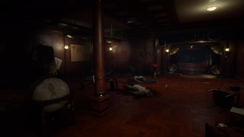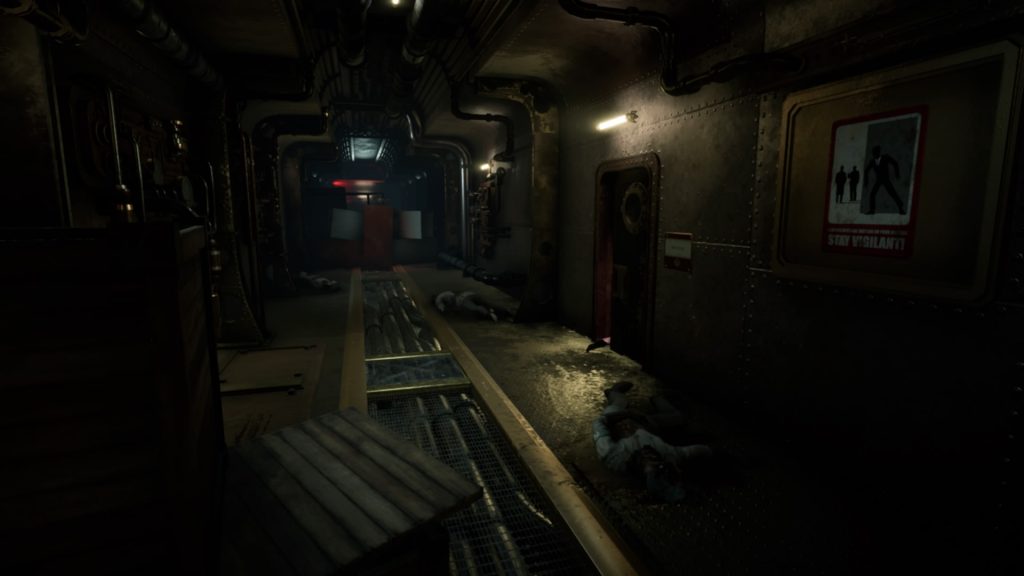 Et jamais deux sans trois, n’est ce pas ? Nous mentionnions précédemment l’aspect survival-horror de Close to the Sun et autant dire que sur ce point les développeurs n’y sont pas allés de main morte. Ce qui est plutôt intéressant dans le jeu est le fait que l’horreur est présente mais savamment dosée. Oui, la plupart des zones sont peuplées de cadavres et de traînées de sang mais ils n’en ont pas trop fait. Il y a bien entendu quelques jump-scares mais assez peu finalement. Ils parviennent d’ailleurs à déconstruire nos attentes : il nous est arrivé plusieurs fois de nous dire « ah, là, je sens que quelqu’un va apparaître dans l’encadrement de la fenêtre ! », et en réalité il ne se passait rien. Le jump-scare était un peu plus loin. À chaque fois, ils sont bien pensés et font monter la pression d’un coup, bien mieux que de courir en vitesse hyper élevée sur un tapis de cardio’. On peut également compter sur des course-poursuites, façon Outlast, alors qu’un psychopathe nous court après avec un couteau plein de sang dans les mains. Et ce n’est pas tout, mais on vous laisse la surprise. Ainsi, si oui Close to the Sun montre l’horreur durant quelques séquences, c’est davantage via l’ambiance créée, qui est savamment dosée, que l’on ressent le côté survival-horror. Petite nature que nous sommes, on a réfléchi à plusieurs fois avant d’ouvrir certaines portes, autant vous le dire.