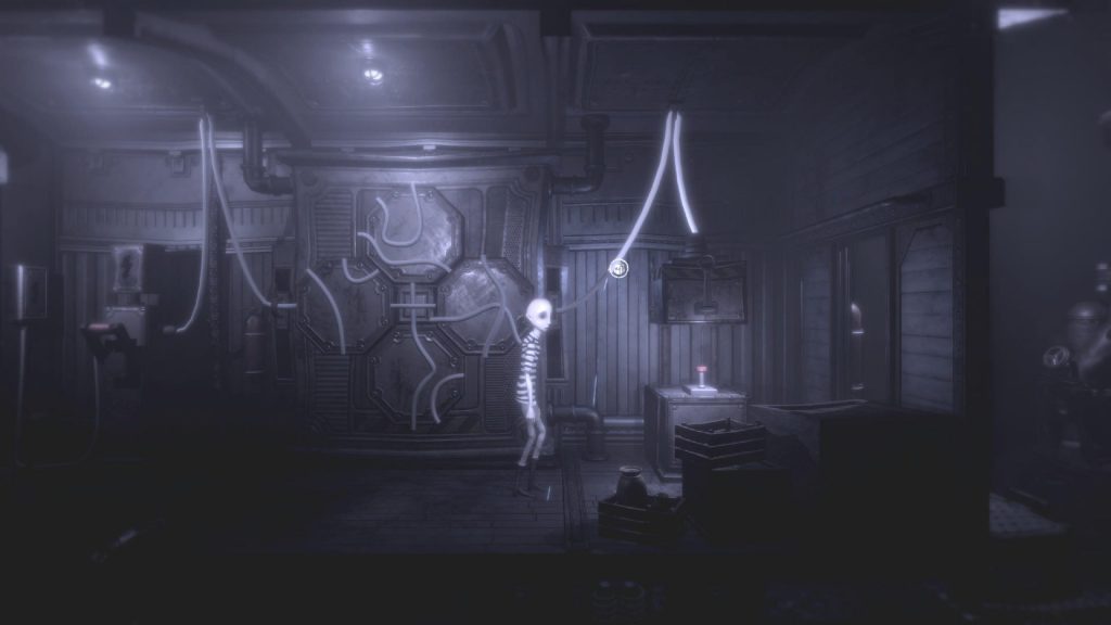 En parlant d’énigmes, revenons un instant sur ce point, qui fait le sel de l’aventure DARQ. Abordé déjà précédemment mais surtout brièvement, vous pourriez croire que le jeu est facile. Pourtant, il n’en est rien et il faudra parfois bien faire travailler vos méninges. Heureusement, on peut compter sur une difficulté et une complexité des énigmes et puzzles progressives afin de prendre ses marques tranquillement et ne pas buter au premier niveau. Par contre, n’espérez pas un tutoriel dans les premières minutes de jeu car Unfold Games vous laisse absolument tout seul. Ce sera donc à vous de comprendre le gameplay de DARQ. Un point qui ne nous a absolument pas gêné tant le système de commandes est assez intuitif et surtout tant cela a le mérite de plonger directement les joueurs dans l’aventure. En ce qui concerne la difficulté et complexité de son aspect puzzle game, laissons-nous vous donner quelques exemples : au début, vous n’aurez qu’à trouver les pièces manquantes, soit des engrenages, pour faire remarcher une machine. Simple jusque là (vidéo de gameplay ci-dessous). Plus tard, vous devrez trouver une « clé étrange », lui donner la forme adéquate grâce à une mécanisme particulier, avant de résoudre un puzzle et afin de retrouver « une jambe coupée » permettant d’actionner un ascenseur tout en évitant des monstres et en jouant sur la perspective. Évidemment, cela ne sera pas les seules actions à effectuer et l’avant dernière zone nous a pris plus de temps qu’une autre, par exemple. Dans un autre niveau, vous devrez jouer avec la linéarité du titre en modulant votre axe horizontal de parcours via une poignée pour accéder à d’autres zones.