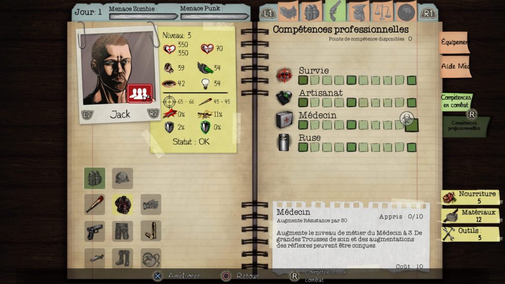 L’aventure de survie Dead Age débute réellement une fois arrivé au campement du groupe de rescapés. Et là, il y a du travail ! Le campement, disponible via une image 3D interactive, est votre nouveau QG et vous permet de préparer vos survivants au mieux et d’organiser les prochaines expéditions. Une fois dans ce menu, il est possible de planifier ou de se plonger dans plusieurs tâches : partir à l’aventure, accéder aux options, voir les défis (pour plus de récompenses) ou aller à la cantine pour discuter avec les différents membres du groupe. Par ailleurs, la gestion de votre équipement et de celui des autres survivants est primordiale puisque chacun devra être équipé des vêtements ou armes nécessaires pour la prochaine expédition et les nombreux combats à venir. Les joueurs amateurs de jeux de gestion y trouveront à coup sûr leur bonheur. Mais les développeurs vont un peu plus loin en proposant de façonner les personnages à notre guise. En effet, chacun d’entre eux peut embrasser une carrière diverse. Par exemple, le médecin du groupe se verra attribuer une mission journalière, se résumant bien souvent à fabriquer de l’équipement médical pour le reste du groupe. À l’inverse, le chasseur devra se mettre en quête de rations et ressources diverses. Comme vous l’aurez compris, tout le soft est régi par un système de craft qui se veut d’ailleurs assez simple mais très bien pensé : les ressources, glanées ici et là durant les missions d’expédition ou différentes quêtes permettent de fabriquer des armes, des objets de soin ou de procéder à des échanges avec des marchands venant régulièrement vous rendre visite. À savoir que le joueur doit donc gérer trois catégories d’objets importants : la nourriture, le matériel et les outils.