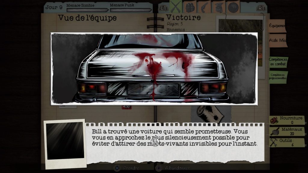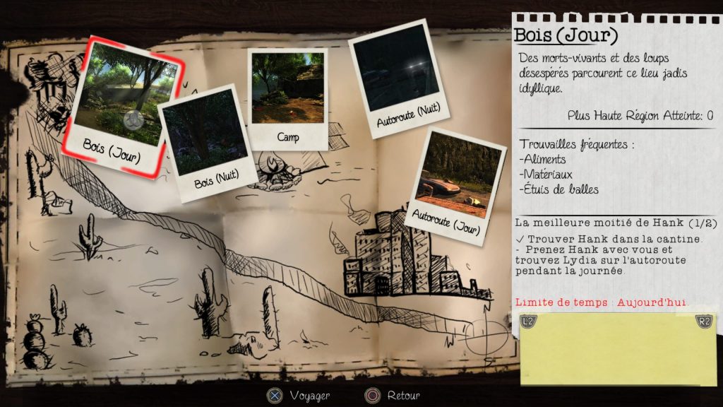 Tout au long de l’aventure, nous sommes donc amenés à réaliser la quête principale ainsi que des missions diverses données par les autres personnages lors des discussions à la cantine. Dans certains cas, quelques unes d’entre elles possèdent un timer, soit par exemple « aller sauver les rescapés aperçus sur l’autoroute avant X temps ». Cela permet de varier l’expérience et surtout d’ajouter davantage de tension à l’aventure. Bien entendu, libre à chacun de réaliser ces quêtes ou de les laisser de côté, mais cela aura nécessairement un impact sur vos relations avec les personnages et la suite des événements. En effet, plus vous aurez de personnages au sein de votre campement, plus la survie sera facilitée à condition de s’occuper d’eux comme il se doit. Que ce soit via les missions d’expéditions ou diverses quêtes, Jack et son groupe sont amenés à visiter différents lieux des environs, assez sommaires mais bien réalisées. Il convient de savoir que chaque lieu est constitué d’une vingtaine de zones dans lesquels les combats se montreront de plus en plus difficiles tant les ennemis sont plus nombreux et agressifs à chaque fois. À tout moment, il est possible de retourner au campement – et c’est recommandé si l’un de vos personnages est sur le point de mourir – mais il faudra alors tout recommencer.