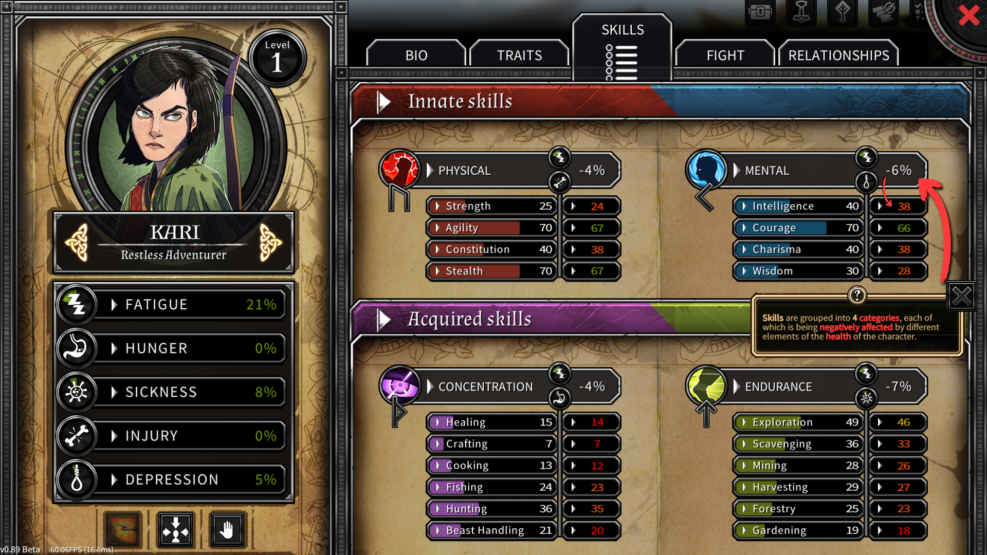 « Porter attention à » est probablement l’expression la plus pertinente pour qualifier l’expérience que propose Dead in Vinland. Tous les personnages bénéficient d’un tableau de statistiques, indiquant leur pourcentage de force, de chasse, de collecte, etc. Un autre indique également leur taux de faim, de déshydration, de maladie, de blessure ou encore de dépression et de fatigue. C’est là que tout se joue ! Devenu manager d’une équipe de vikings, le joueur devra constamment porter attention à ces statistiques afin de ne pas laisser mourir l’un des personnages (la mort de l’un d’entre eux entraîne un game over), tout en progressant. Par exemple, si l’un des membres de la famille affiche un taux de fatigue de 60%, il vaudra peut-être mieux le renvoyer à l’abri afin qu’il se repose plutôt que de lui attribuer une autre tâche harassante. Il en va de même pour la dépression. Heureusement, certains items (bières, potions, etc), qu’il est possible de looter, permettent de faire baisser ces taux, s’ils sont attribués à la bonne personne et selon une dose correcte. Tous ces paramètres sont plutôt bien amenés dans le jeu et constituent toute son essence. Malgré le petit pic de difficulté qui se présente assez rapidement, on a très envie de continuer l’aventure, d’en découvrir davantage et de parvenir à faire de cet abri un nouvel havre de paix (plus ou moins) dès les premières minutes de jeu.