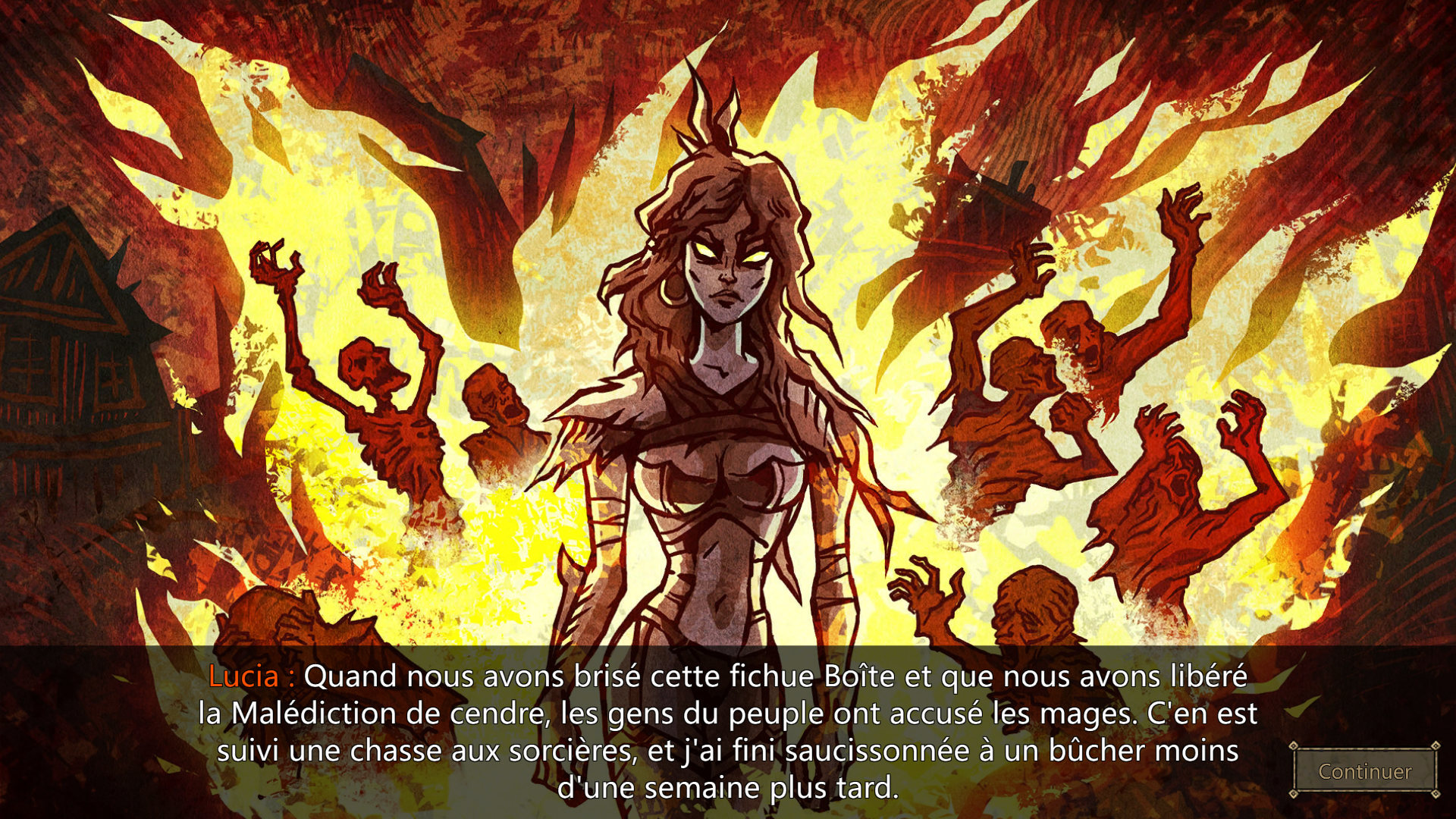 Dans Deck of Ashes, le joueur est ainsi amené à incarner l’un des personnages de la bande des Réprouvés (pour commencer). Le premier personnage à incarner est la femme du gang des Réprouvés. Ayant révélé ses pouvoirs magiques à son mari, ce dernier l’a trahi et a alerté les autorités locales. Elle se retrouve ainsi sur le bûcher, brûlée vive mais parvient miraculeusement à en sortir vivante, inspirant ainsi la peur et la terreur dans les yeux des villageois. Tourmentée par ce mal la dévorant à petit feu (on retiendra ce jeu de mot), elle entend bien retrouver la Dame de la Mort, afin de la tuer et annuler ce maléfice. C’est ainsi que commence votre périple, durant lequel vous aurez à faire à de nombreuses créatures, les plus malfaisantes et laides possible, dans des terres désolées et aux paysages rongés par le Mal.