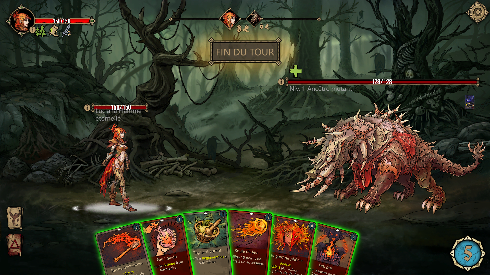 Heureusement, le jeu vous laisse le temps de prendre connaissance du gameplay, grâce à un tutoriel assez complet disponible dès le menu principal du jeu. D’ailleurs, une fois la campagne lancée, pour chaque chapitre, deux phases de gameplay sont disponibles : à commencer par une étape d’exploration, vous permettant de vous déplacer sur une carte pour récupérer des ressources, rencontrer différents personnages, interagir avec des événements ou tuer des adversaires plus ou moins difficiles. Moment qui vous permettra également de tester les différentes modifications opérées par vos soins quant à votre deck. La deuxième phase, quant à elle, est beaucoup plus difficile car vous y affronterez le gardien des lieux, parti à vos trousses depuis votre entrée dans les lieux. Dans le cas du premier chapitre, le boss final est l’ancêtre mutant, sorte de sanglier démoniaque, qui se révèle être un véritable sac à PV. Pour continuer votre périple vers la Dame de la Mort, il faudra ainsi traverser différents lieux, et vaincre à chaque fois le boss. Sachez cependant que si vous mourez lors du combat final, vous devrez recommencer le chapitre entier depuis le début. Punitif, tout de même ! Rassurez-vous pour autant, le jeu est relativement simple à prendre en main, dès que l’on a saisi l’essence même de son gameplay, et que l’on se montre assez prudent lors des combats. Avec cet Early Access, disponible pour 12,49 € sur Steam, il est possible de venir à bout, assez facilement, des quatre chapitres proposés en moins de 8 à 10 heures de jeu. Certains joueurs, familiers du genre, pourront traverser le jeu en moins de 5 heures, alors que d’autres mettront probablement plus de temps, et devront réessayer plusieurs phases… Cela dépend essentiellement de vous, donc !