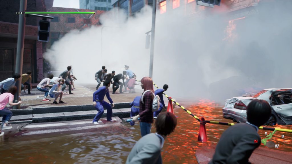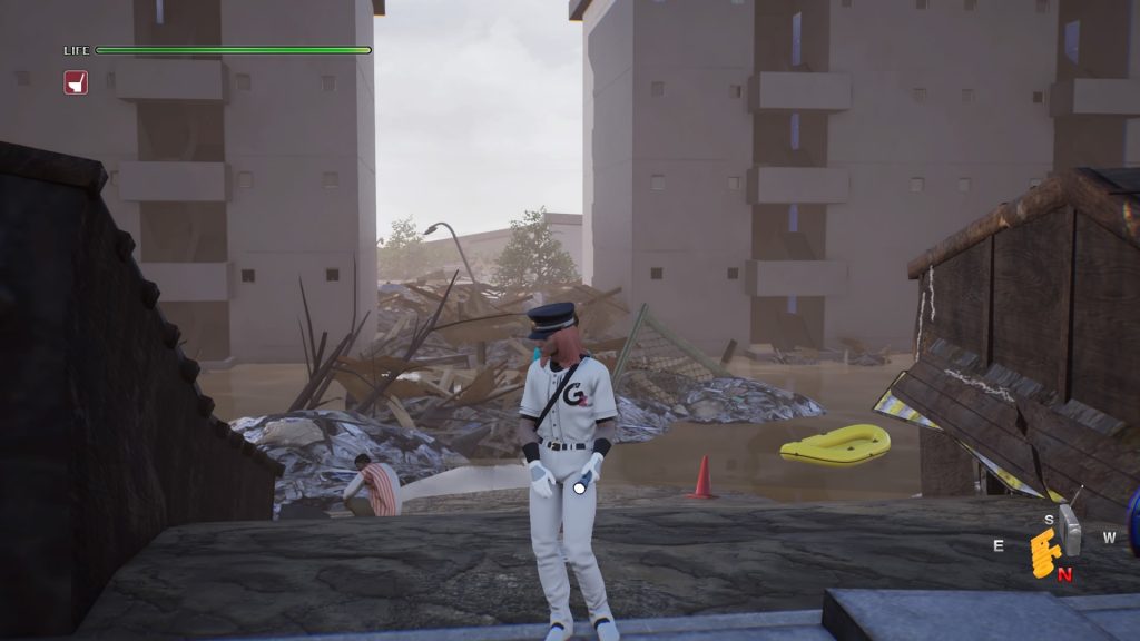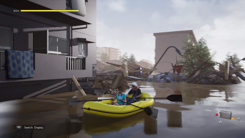 Plus archaïques que notre grand-mère chapardant une place du bus, les mécaniques de gameplay se confortent à la pression de trois touches. Les mauvaises langues diront quatre si nous comptons le bouton pause, mais la réalité veut que croix, R1 et carré seront les seuls avec de l’importance. Disaster Report 4: Summer Memories enchaîne les tableaux dans lesquels le joueur doit trouver les actions à réaliser, et les faire dans le bon ordre pour passer au suivant. Rien de bien compliqué, ce qui nous donne un jeu s’inscrivant plus dans la contemplation que la recherche frénétique ou l’exploration hâtive. Non, le jeu prend son temps, vous martelez X dès que possible pour prendre un objet, parlez à un personnage, puis parfois quand le sol tremble vous maintiendrez carré pour ne pas perdre l’équilibre. Vous avez aussi un sac à dos pour ranger vos sandwichs triangles si la faim se fait sentir. Figurez-vous que même le stress et vos besoins rudimentaires devront êtres soulagés. Toutefois, nous ne savons pas si les deux vont de paire. Parfois le jeu a un coup de sang, la musique s’emballe et vous comprenez que vous devez courir pour rejoindre un point ou que la situation est urgente. Vous enchaînerez les mésaventures mais jamais sans véritablement vous lasser. Ce qui est étrange, voire paradoxale, dans sa grande simplicité : Disaster Report 4 a cette petite chose qui fait accrocher. Il faudra compter un peu moins d’une dizaine d’heures pour terminer le jeu. Ce qui est relativement court, accordons-nous. Néanmoins deux ou trois heures supplémentaires auraient rendu le jeu longuet et moins intéressant. Si vraiment vous souhaitez prolonger l’expérience, des collectibles sont cachés dans les niveaux, des tenues et coupes de cheveux. Surtout ! Et nous y tenons. Des boussoles ! Elles ne servent à rien, hors indiquer faussement les points cardinaux (que vous n’utiliserez pas, rassurez-vous). Or ,un véritable génie d’imagination est déployé pour leur donner diverses formes. De la Loli ou chef d’orchestre en passant par le trèfle, vous en aurez pour votre recherche.