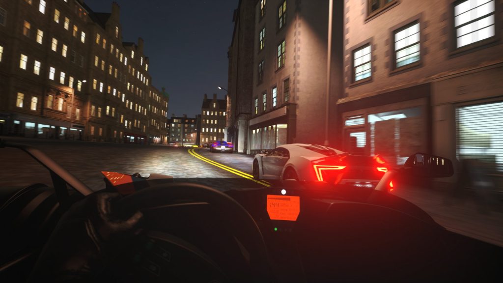 Nous pouvons aussi nous demander si les graphismes n’influencent pas cette impression. Alors que le titre d’origine (en comptant toutes les dernières mises à jour) affiche un joli rendu, DriveClub VR traîne avec surprise des textures et un aliasing prononcé, loin de convaincre pour de la PS4. Et cela, sans compter l’étrange downgrade des effets sonores. Pire encore, la météo se voit purement supprimée des paramètres, sachant qu’il s’agit de base d’une des fonctionnalités les plus réussies. Le résultat n’est pas pour autant repoussant, les voitures ainsi que leurs intérieurs étant pour le coup appréciables. Les développeurs ont essayé de retranscrire au mieux le pilote, sa position étant réglable par ailleurs, et il faut avouer que le fait de pouvoir tourner la tête comme bon nous semble est assez amusant. De même, certains effets de lumière sont particulièrement agréables, à l’instar du cycle jour/nuit.