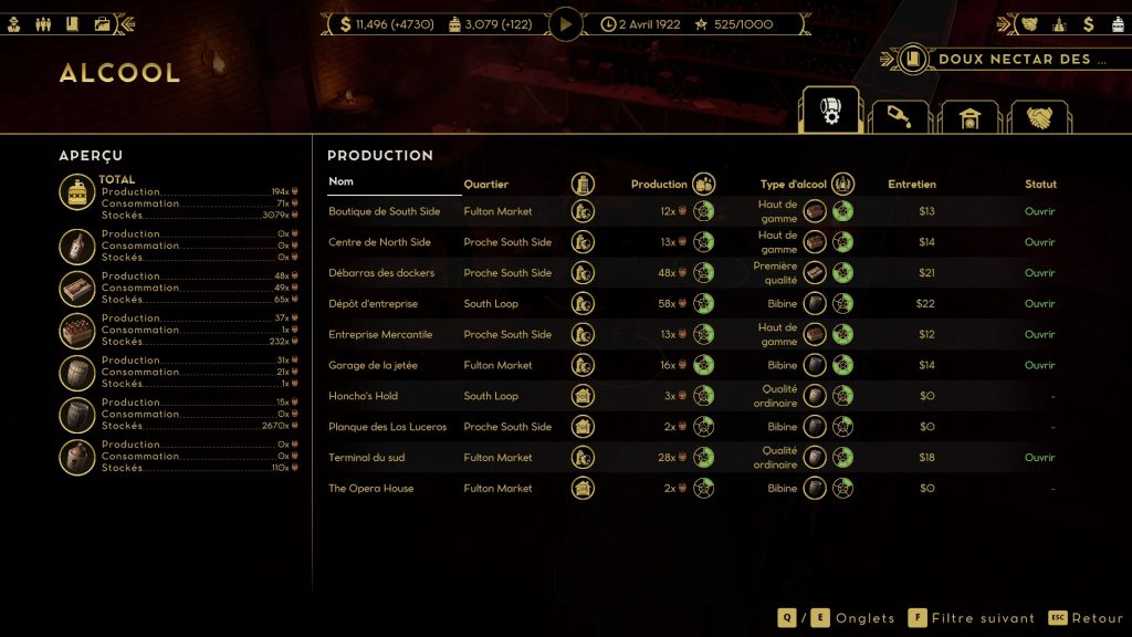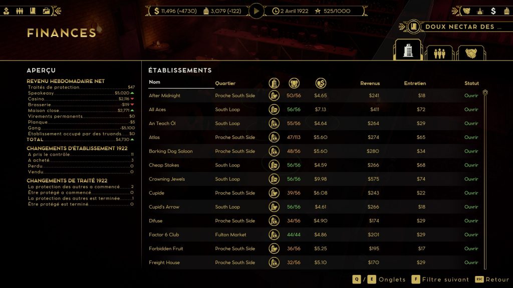 Avant de parler empire, il faut avoir une assise et trouver comment installer ses infrastructures. On déambule donc avec son gangster dans les rues, à la recherche d’un immeuble susceptible d’accueillir notre première entreprise. Ainsi on remarque qu’avec chance le quartier populaire abrite bon nombre de petites brutes qui se sont établies dans des bâtiments abandonnés. En les délogeant on prend le contrôle de ce dernier, et on peut alors y préparer notre premier commerce. Plusieurs sont disponibles, comme les bars, les bordels et les casinos. Les trois ont des effets propres, les bars génèrent plus d’argent que les bordels, mais sont moins discrets, alors que le casino fera la pluie et le beau temps de vos finances. Une fois ce choix fait, il est possible d’appliquer diverses modifications comme ajouter de la sécurité, améliorer l’ambiance ou bien encore travailler la discrétion et le bouche-à-oreille pour repousser une hypothétique descente de flics et attirer des clients. Tous ces bâtiments ont néanmoins besoin d’une chose : de la gnôle. Prohibition oblige, on est à la fois brasseur, transporteur et vendeur (voire exportateur). Les brasseries sont le poumon des revenus, car sans alcool, pas de clients, sans clients c’est la faillite.