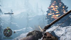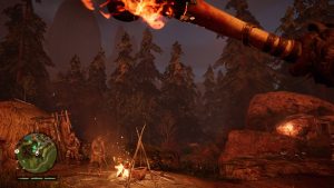 Ces armes se déclinent tout de même en différentes versions et peuvent quasiment toutes être enflammées pour mettre le feu à un village ennemi ou pour de nombreuses autres utilisations. En effet, à cette époque le feu était évidemment très important et Ubisoft a tenté de le rendre aussi indispensable dans le jeu. Un gourdin enflammé avec de la graisse animale vous permettra par exemple de vous éclairer dans les très nombreuses grottes du jeu, d’éloigner les prédateurs rodant la nuit autour de vous, ou encore afin de vous réchauffer au coin d’un feu dans les zones nordiques enneigées qui pourraient vous faire succomber de froid en y restant trop longtemps. Far Cry Primal est un excellent plongeon dans un univers pré-historique trop peu abordé dans le jeu vidéo. Anecdote surprenante, Ubisoft a d’ailleurs fait appel à des linguistes américains pour créer les dialogues avec un dialecte très ancien, à la base de toutes les langues d’aujourd’hui. Les sous-titres sont donc indispensables et sont pour une fois assez lisibles à de rares expressions près.