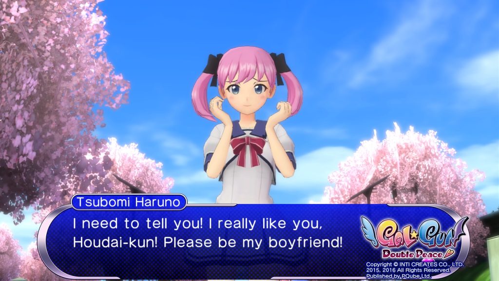 Gal*Gun: Double Peace propose un scénario typiquement japonais mettant en scène un adolescent qui souhaite rencontrer l’amour… et qui bien évidemment étudie dans un lycée où il est le seul garçon. La légende raconte qu’un ange de l’amour fait parfois son apparition sur le campus et tire sa flèche sur une personne afin de lui donner l’aura nécessaire pour séduire sa partenaire. L’ange Ekoro est donc bien venu au lycée pour aider le protagoniste principal Houdai Kudoki à trouver l’amour et vaincre sa timidité, mais c’était sans compter la présence du démon Kurona qui cherche de son côté à nuire à notre jeune héros… Dans la précipitation, Ekoro tire 32 fois la dose conseillée sur Houdai, et c’est à ce moment que notre aventure commence, puisque ce puissant charme aura pour conséquence de rendre toutes les filles amoureuses de notre innocent garçon. Attention tout de même, puisque que si dans les prochaines 24 heures notre héros n’a toujours pas trouvé l’amour, il restera célibataire toute sa vie.