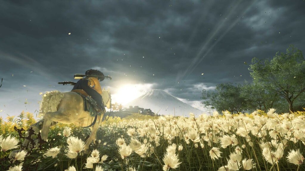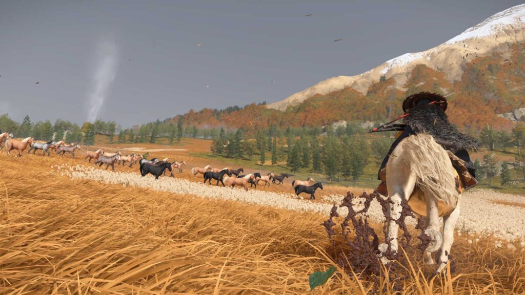 On ne va pas se mentir : le studio sait ce qu’il fait et le prouve à travers ses dernières démonstrations. Si vous ne les avez pas encore vues, sachez que les paysages proposés par Ghost of Yōtei sont tout simplement sublimes. Nous vous parlions d’immersion plus tôt : celle-ci est renforcée par une faune abondante – cerfs, grues ou encore chevaux sauvages parcourent les vastes plaines du jeu. Difficile de résister à l’envie d’utiliser le mode photo, qui, pour les amateurs, offre de nombreuses fonctionnalités très appréciables. Le monde est splendide, grouillant de vie et de couleurs chatoyantes, tandis qu’au loin la fumée s’élève, nous donnant envie d’aller y jeter un œil.