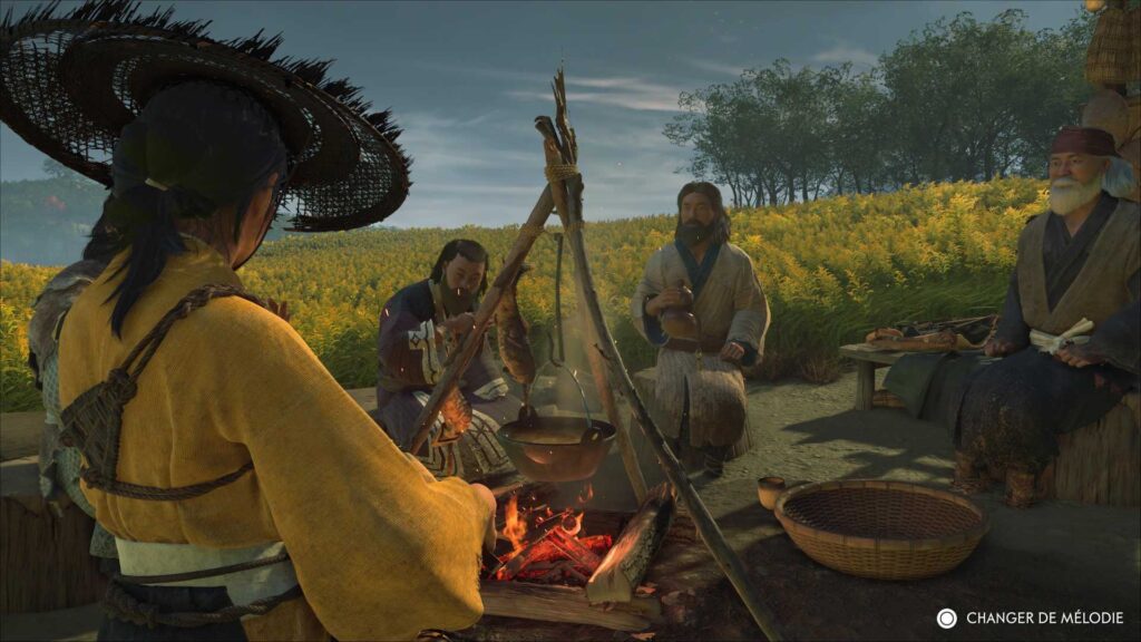 Se concentrer uniquement sur le gameplay des combats serait un véritable gâchis au regard de la vraie nouveauté qu’apporte Ghost of Yōtei : l’immersion. Sucker Punch Productions a souhaité faire de son titre un véritable voyage dans le temps en poussant le curseur de l’immersion encore plus loin. Les PNJ interagissent, se promènent sur la carte et peuvent interpeller Atsu pour lui demander de l’aide. Un panneau de quêtes présent que vous pouvez consulter permet aux mercenaires de gagner un peu d’argent en chassant les malandrins. Le monde s’en retrouve ainsi plus vivant, plus crédible. Il sera même possible d’utiliser une forge, de pêcher ou encore de peindre des estampes, cette dernière activité remplace les compositions de haïkus de Jin Sakai. À cela s’ajoute désormais la possibilité d’installer un petit campement où l’on désire, à condition que le cheval soit à proximité.