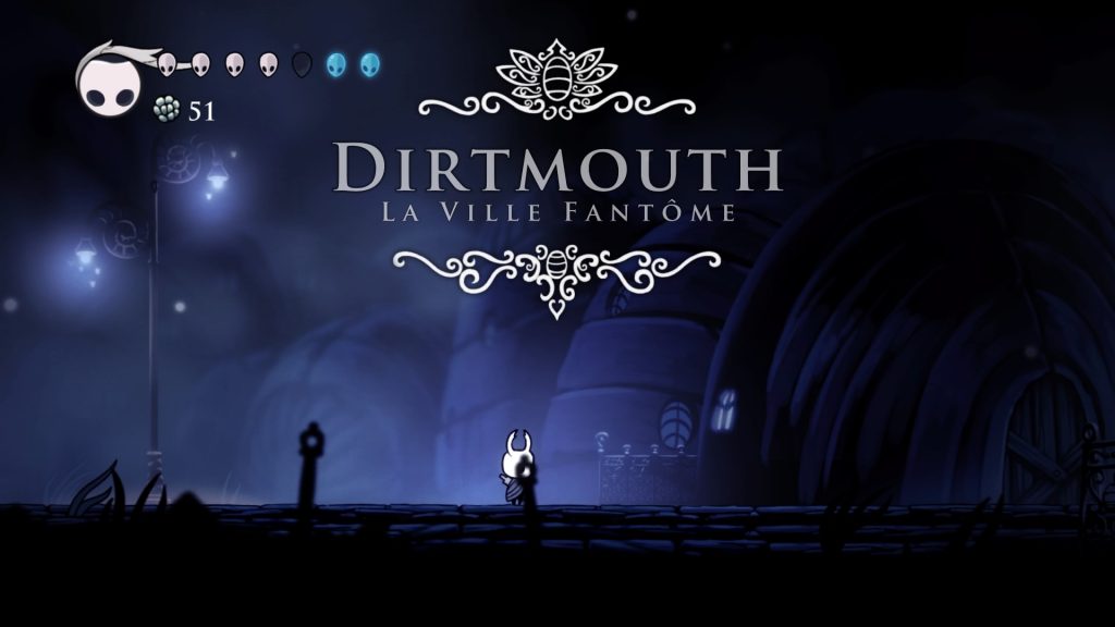 Ainsi, dans Hollow Knight, le joueur est amené à explorer le monde d’Hallownest, constitué de différentes villes et surtout de nombreux souterrains, dans lesquels regorgent des insectes plus ou moins féroces. D’ailleurs, le bestiaire est plutôt conséquent car il dénombre pas moins de 130 espèces hostiles et une trentaine de boss divers. Que l’on se rassure, beaucoup de PNJ, situés dans les différentes villes du jeu, comme Dirtmouth, seront là pour vous aider durant votre aventure. Par exemple, certains vous vendront des objets en échange de quelques pièces de votre monnaie in-game. Dans ce cas précis, un PNJ est très important, nous en reparlerons par la suite. Avant de parler du stuff et des actions disponibles, un petit point côté santé. En débutant un run, vous possédez plusieurs vies (matérialisées en haut à gauche de votre écran par des crânes). Si vous perdez toutes vos vies, vous mourrez et recommencez. Un peu comme un rogue-lite. Avec une difficulté un peu moindre, car en tuant des mobs, la jauge en haut à gauche se remplit et vous permet de matérialiser des vies supplémentaires (crânes en bleu clair sur l’image ci-dessous). Ainsi, cela accorde tout de même un peu de répit pendant le run, si tant est que l’on prenne un peu de risques pour gagner en santé.