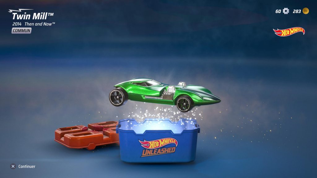 Fort de 66 véhicules au lancement (et d’autres à venir avec les futures mises à jour), Hot Wheels Unleashed permet aux joueurs de conduire de nombreuses voitures officielles issues de marques (Audi, Fiat…) ou de franchises (Batman, Snoopy…). Chacune possède ses propres caractéristiques : vitesse, puissance de freinage, accélération, maniabilité et une quantité de boost maximale. Réparties en 4 catégories de rareté : commun, rare, légendaire et super chasse au trésor, il est possible, grâce aux engrenages gagnés lors des courses ou lors de la revente de véhicules en double, de passer d’une catégorie à une autre pour votre voiture préférée. Cette action augmente donc les statistiques de votre bolide et vous permet d’être compétitif tout en gardant une voiture à votre goût esthétiquement. Pour enrichir votre collection, des boîtes à ouvrir sont nécessaires. Vous les remporterez lors des victoires dans le mode Hot Wheels City Rumble ou vous pouvez en acheter grâce à l’argent virtuel gagné dans le jeu. Fait reprochable : vous pouvez ouvrir une boîte et obtenir une voiture en doublon, il sera donc très difficile de remplir votre collection à 100%, sauf si la machine recherchée est mise en vente dans la boutique du jeu (toujours contre de l’argent virtuel avec un prix défini selon la rareté).